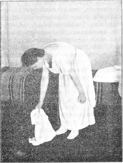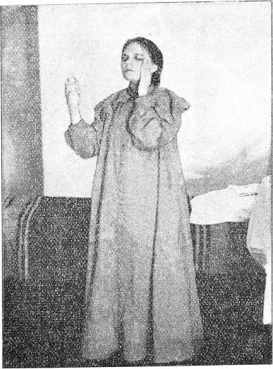 Въ земской больницѣ больная пробыла съ 7-го по 24 сентября, засыпала три раза, при этомъ первый разъ спала трое сутокъ, второй —двое, третій—10 часовъ и четвертый— одинъ часъ. Каждый разъ сонъ и оцѣпенѣніе наступали не ожиданно, безъ какихъ-либо предшествовавшихъ явленій, и больная застывала въ томъ положеніи, въ какомъ ее заставалъ сонъ. Прилагаемые рисунки могутъ служить довольно яркой иллюстраціей только-что сказаннаго: больная (рис. 1) заснула въ тотъ моментъ, когда наклонилась поднять упавшую во время изслѣдованія кофточку. Второй рисунокъ святъ съ другого положенія: сонъ застигъ больную въ тотъ моментъ когда она потянулась за книгой, лежавшей на столикѣ около кровати, и только-что успѣла взять ее въ руку. Наконецъ, на третьемъ рисункѣ изображенъ тотъ моментъ, когда больная приготовилась уже выпить предложенное ей лекарство, но тоже заснула.