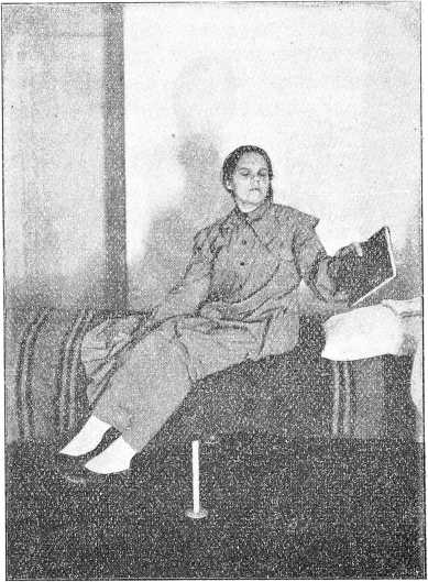 Съ 28 марта по 6 мая больная заснула всего одинъ разъ, 5 апрѣля и то только на нѣсколько часовъ. Между прочимъ, 25 апрѣля больной случайно не подали бульонъ съ котлетой на что больная обидѣлась и сказала: „тогда мнѣ ничего не надо". На всѣ просьбы съѣсть что-нибудь другое она отвѣчала категорическимъ отказомъ. Съ тѣхъ поръ и по настоящее время кормится черезъ зондъ. Въ теченіи первыхъ мѣсяцевъ при кормленіи больная не чувствовала никакихъ болей, но за послѣднее время при введеніи зонда больная жалуется на болѣзненность въ носу и пищеводѣ. Въ концѣ апрѣля больная стала жаловаться на особенно гнетущее состояніе, какого она еще не испытывала никогда, почему и стала просить перевести ее въ другое отдѣленіе, расчитывая, что на новомъ мѣстѣ перемѣнится настроеніе, но надежды ея не оправдались. Въ то же время больная отмѣчаетъ у себя нѣкоторыя психическія измѣненія, такъ ей большого труда стоитъ усвоить что-нибудь изъ прочитаннаго, тогда какъ раньше чтеніе было любимымъ ея занятіемъ—она легко утомляется; трудно написать письмо матери, ей кажется, что она не можетъ связать нѣсколько словъ.