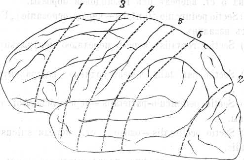 Рис. № I. Вскрытіе полушарія по Pitres. Пунктиромъ показаны разрѣзы; цифры около указываютъ на порядокъ, въ которомъ сѣченія налагаются. Рисунокъ копированъ мною по Nauwerck.