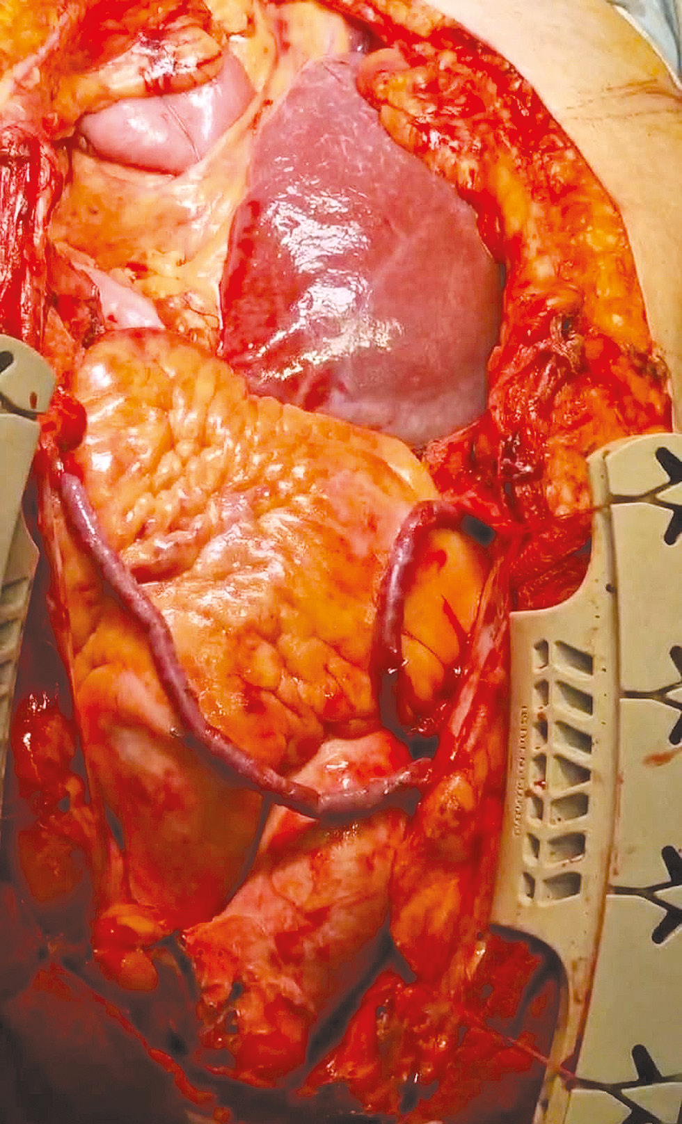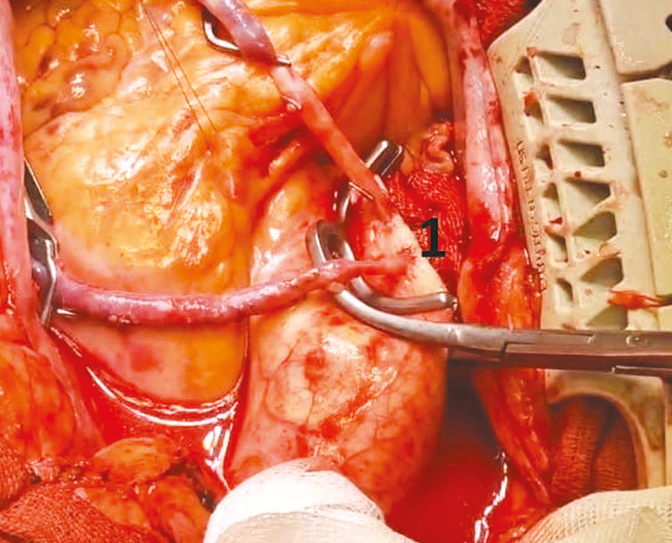 В условиях комбинированного эндотрахеального наркоза выполнена левобоковая мини-торакотомия с одномоментным забором большой подкожной вены с правой голени. Выделены левые общая бедренная артерия (ОБА) и общая бедренная вена (ОБВ), после их канюляции начато ИК. Мобилизована восходящая аорта, установлены плегическая канюля, зажим на аорту. Проведена антеградная неселективная калиево-кровяная кардиоплегия по Калафиори. ЗМЖА – неизменённая, мягкая, диаметром 2 мм. Вскрыт просвет ЗМЖА на границе средней и дистальной третей. Сформирован анастомоз аутовены с ЗМЖА по типу «конец-в-бок» непрерывным обвивным швом нитью Prolene 8-0. Анастомоз герметичен. При проведении гидродинамической пробы сброс по шунту удовлетворительный. ОА в средней трети выраженно атеросклеротически изменена, в дистальной трети – мягкая, диаметром 2 мм. Вскрыт просвет ОА на границе средней и дистальной третей. Вскрыт просвет аутовены к ЗМЖА для выполнения секвенциального шунтирования. Сформирован анастомоз аутовены с ОА по типу «бок-в-бок» непрерывным обвивным швом нитью Prolene 8-0. Анастомоз герметичен. Снят зажим с аорты. Выявлена фибрилляция желудочков. Синусовый ритм восстановлен после дефибрилляции. Выполнено боковое отжатие восходящей аорты. Плегическое отверстие расширено при помощи выкусывателя. Сформирован проксимальный герметичный анастомоз аутовены с аортой по типу «конец-в-бок» непрерывным обвивным швом нитью Prolene 6-0. Снят зажим с аорты. Снижена производительность и остановлено ИК. Введён протамин. Проведена деканюляция ОБВ и ОБА. Перикард частично ушит. После тщательного гемостаза и установки двух дренажей в правую плевральную полость выполнено послойное ушивание раны. Пациент гемодинамически стабилен, переведён в отделение реанимации. Ишемия миокарда – 59 мин, ИК – 125 мин. Время операции составило 270 мин, кровопотеря – около 300 мл (рис. 1).