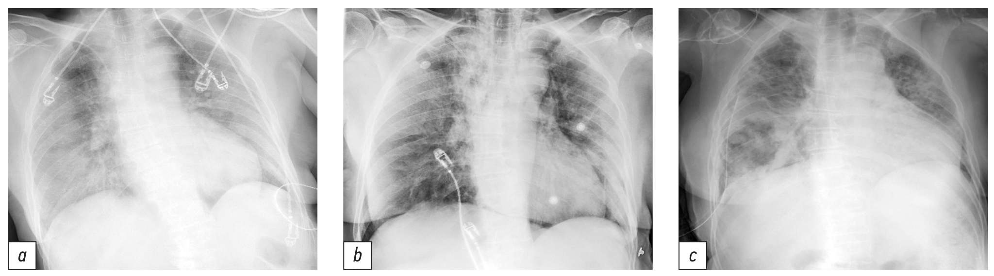 Рис. 1. Рентгенография лёгких (цифровая, прямая задняя проекция): а ― 9-е сут болезни (обширные субплевральные участки снижения пневматизации обоих лёгких с нечёткими контурами, средней и низкой плотности ― двусторонняя интерстициальная пневмония); b ― 15-е сут болезни (положительная динамика в виде уменьшения интенсивности инфильтрации лёгочной ткани над обоими лёгочными полями); с ― 27-е сут болезни (справа в нижних отделах визуализируется негомогенный участок просветления 60×74 мм с толстыми стенками).