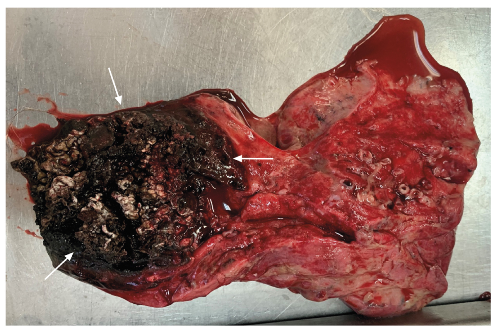 В нижней доле правого лёгкого субплеврально обнаружено опухолеподобное образование, представленное обширной полостью деструкции неправильной округлой формы диаметром до 8 см с плотными, неровными, фестончатыми краями чёрно-серого цвета (рис. 2). Полость заполнена сухими серо-чёрными массами губчатого вида, покрытыми плёнкой из переплетающихся тонких филаментов, различимых невооружённым глазом; перифокально-сероватые зернистые очаги без чётких границ диаметром до 1 см, определяемые также в левом лёгком.