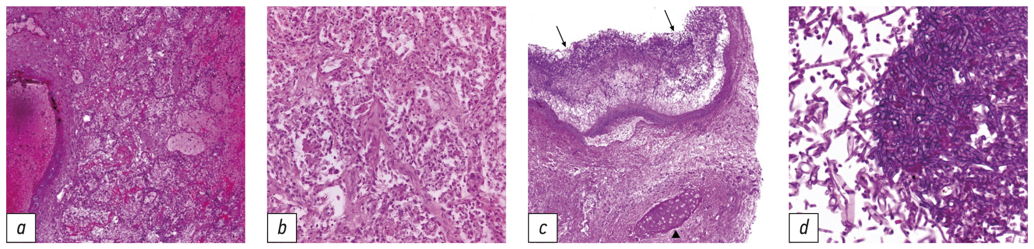 При микроскопическом исследовании в лёгких картина полнокровия, кровоизлияния с формированием геморрагических инфарктов, внутриальвеолярный отёк (рис. 3, а); признаки диффузного альвеолярного повреждения: выраженная пролиферация и десквамация альвеолярного эпителия с участками очаговой плоскоклеточной метаплазии, грануляционная ткань и организующийся фибрин в просветах альвеол (см. рис. 3, b). Стенка опухолевидного образования в нижней доле правого лёгкого представлена детритом с массивными наложениями септированного мицелия грибов с дихотомическим ветвлением под углом 45° и множественными конидиальными головками, морфологически соответствующих роду Aspergillus (рис. 3, c, d). По периферии образование окружено тонкой капсулой из рыхлой волокнистой соединительной ткани, что свидетельствует о длительности течения процесса. Наряду с этим в других отделах обоих лёгких определяется очаговая деструкция межальвеолярных перегородок с образованием мелких полостей, заполненных детритом и скоплениями сегментоядерных нейтрофилов, с пролиферацией мицелия грибов, положительно окрашиваемого при ШИК-реакции. В просветах отдельных бронхов и сосудов также обнаружены грибковые гифы и конидиальные головки с инвазией их стенок.