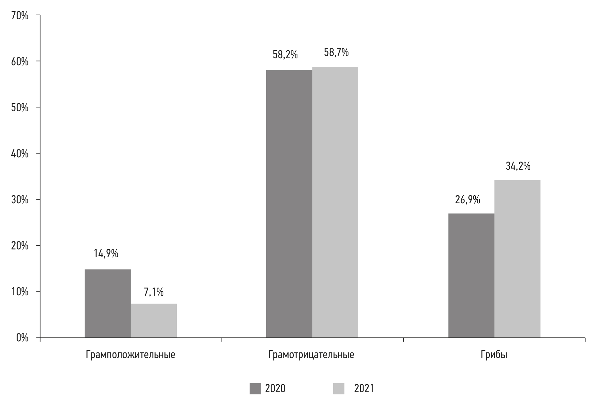 В микробном пейзаже дыхательных путей у больных новой коронавирусной инфекцией наблюдается преобладание грамотрицательной микробной флоры (рис. 1), 1/3 выделенных культур представлена грибами (рис. 2). В течение двух лет пандемии наблюдается тенденция роста числа выделяемых грибковых культур в общей доле микроорганизмов с 26,9% в 2020 г. до 34,2% в 2021 г. При этом доля грамположительных возбудителей снизилась за этот период в два раза — с 14,9 до 7,1%.