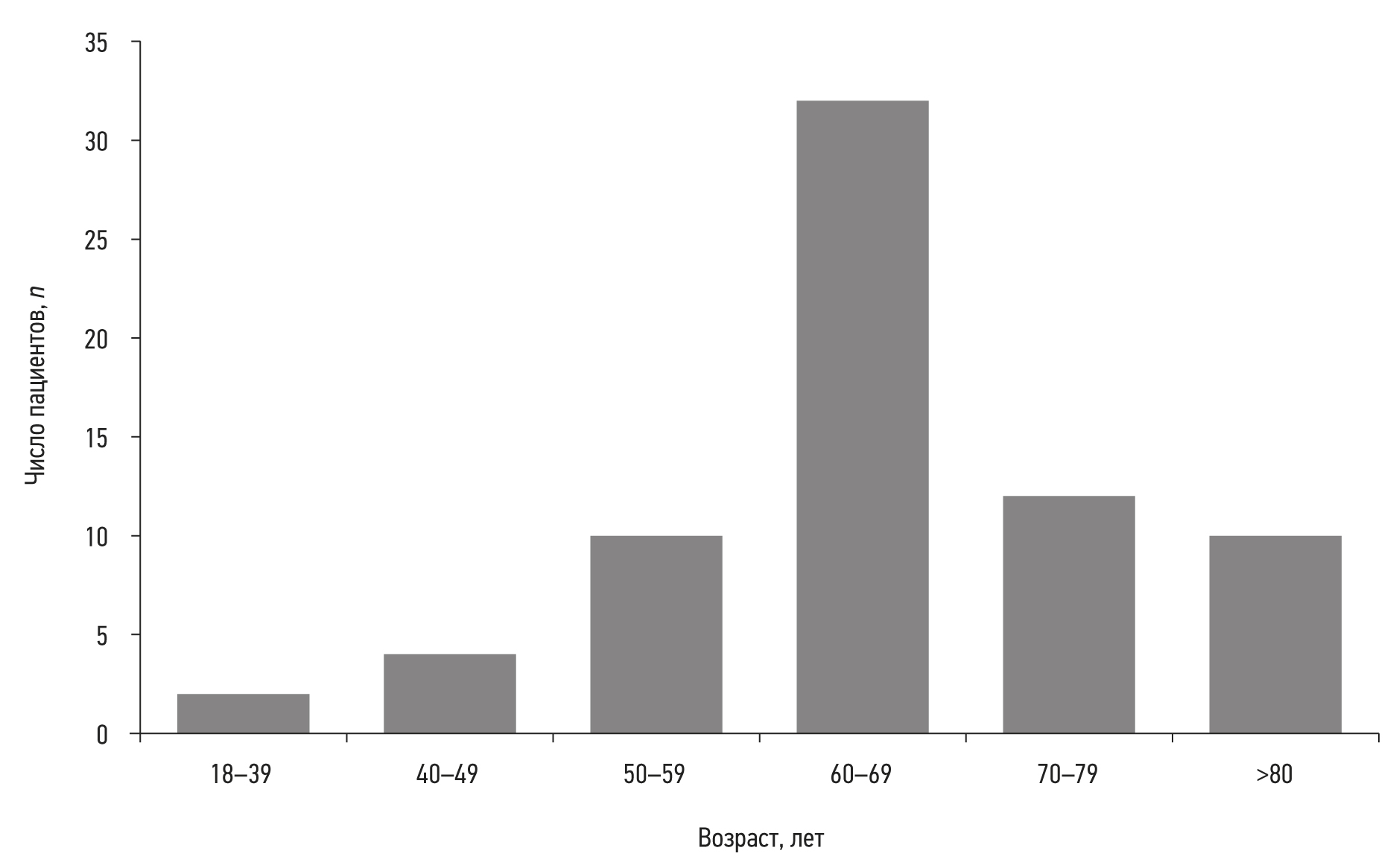 Средний возраст пациентов с проявлениями инвазивного мукормикоза составил 54,6 года [24]. В нашем наблюдении регистрация грибковых осложнений также охватывала преимущественно возрастные группы старше 50 лет: 10 человек были в возрасте 50–59 лет, мы посчитали нужным их учесть; на 60 лет приходился пик. Все наблюдаемые нами пациенты имели отягощённый преморбидный фон. В большинстве случаев присутствовала различная патология со стороны сердечно-сосудистой системы (преимущественно гипертоническая болезнь, хроническая сердечная недостаточность). Диабет имел место только в 10% случаев, дополнительно у 13,3% пациентов отмечалась транзиторная гипергликемия на фоне проводимой терапии, в то время как избыточная масса тела определялась у 60 пациентов с грибковыми поражениями. В отличие от мукормикоза, гипергликемию нельзя отнести к ведущим факторам риска развития кандидозных осложнений новой коронавирусной инфекции.