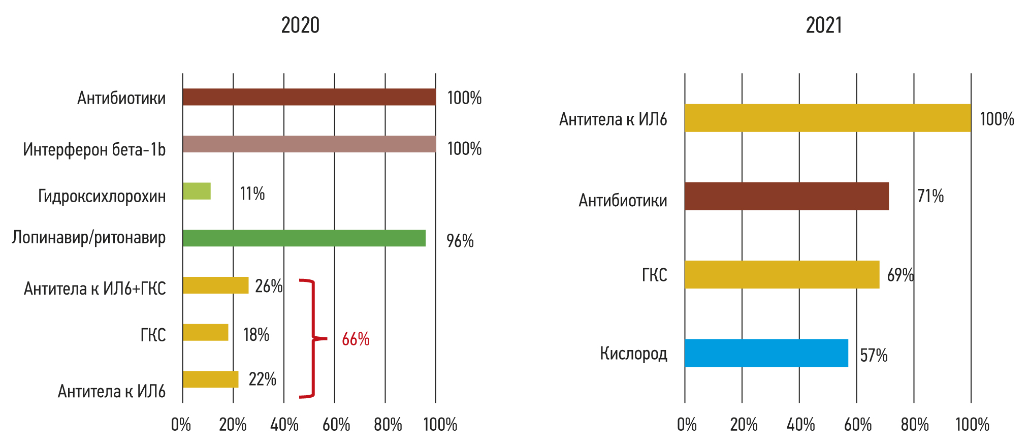 В 2021 г. интерферон бета-1b и лопинавир/ритонавир из схем лечения исключены, а частота назначения антибиотикотерапии сократилась в рассматриваемой группе до 71,4%. В то же время в терапии всех пациентов, помимо противовирусных средств, присутствовали таргетные иммуносупрессивные препараты (ингибиторы интерлейкина-6). В 68,6% случаев они сочетались с назначением глюкокортикоидных препаратов. Антибиотики получали пациенты при тяжёлом течении, в схему терапии за весь курс лечения входило от 1 до 5 антибактериальных препаратов. Инсуфляция кислородом присутствовала у 57,1% пациентов (см. рис. 5). Несмотря на различие в терапевтических схемах, выделение грибковых культур с близкой частотой 26,9–34,2% присутствовало как в 2020, так и 2021 г. (см. рис. 1). Увеличению доли грибковых культур в 2021 г. и появлению представителей плесневых грибов могло способствовать увеличение частоты и интенсивности проводимой иммуносупрессивной терапии.