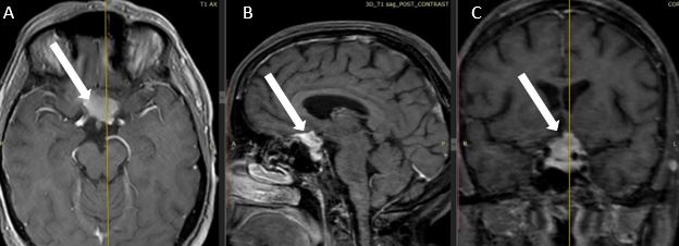 Рисунок 1. – МР-томограммы с контрастным усилением пациентки с менингиомой бугорка основной кости, белой стрелкой указана менингиома. А – аксиальная проекция, B – сагиттальная проекция, С – коронарная проекция