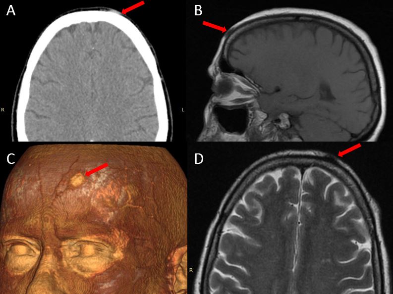 Рисунок 2. – Магнитно-резонансная (B,D) и компьютерная (А,С) томограммы пациентки. Крансая стрелка указывает на локализацию гельминта D.repens. А – компьютерная томография в аксиальной проекции; B – магнитно-резонансная томограмма в режиме T1 в сагиттальной проекции; С – трехмерная реконструкция компьютерной томографии головы; D - магнитно-резонансная томограмма в режиме T2 в аксиальной проекции.