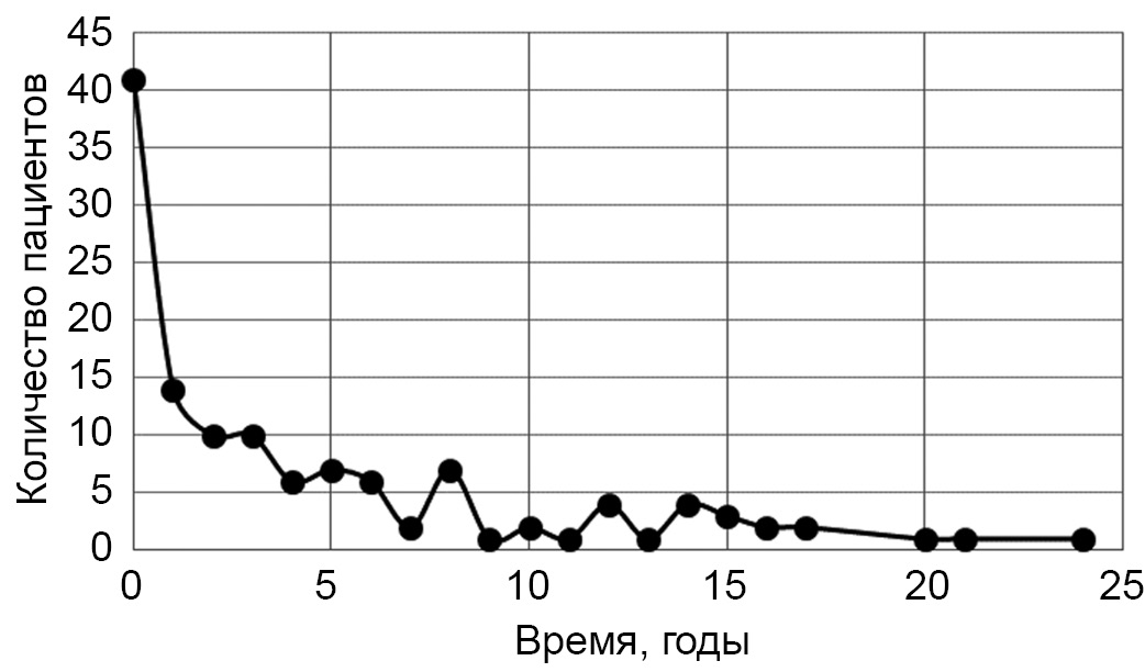 В большинстве случаев (59,5 ± 4,37%) пациенты обращались за медицинской помощью уже на стадии исхода вирусного гепатита в цирроз печени. Так, в 32,5 ± 4,17% случаев диагноз цирроза печени был установлен в год первого обращения, в 27,0 ± 3,95% ― в течение первых трех лет с момента выявления маркеров гепатита С (рис. 1); в период от 4 до 8 лет наблюдения ― еще у 22,2 ± 3,70%. От 9 до 24 лет от первого выявления маркеров гепатита до постановки диагноза цирроза печени прошло у 18,3 ± 3,44% пациентов, при этом прогрессирование цирроза с переходом в следующую стадию произошло в 6,35 ± 2,17% случаев в течение 3 лет наблюдения.