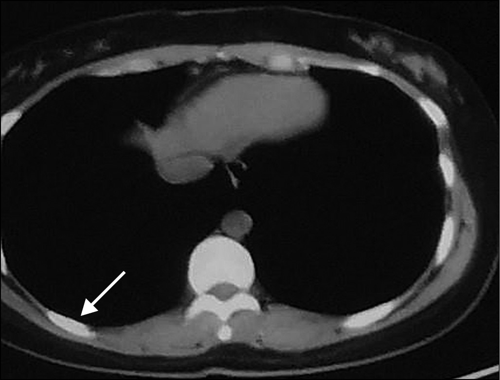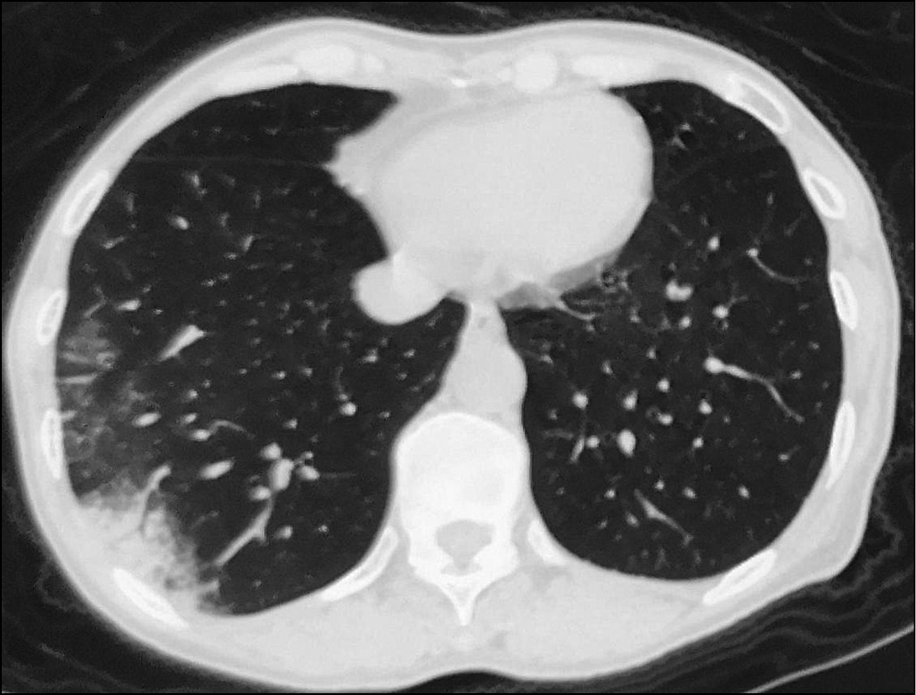 Рис. 1. Симптом «матового стекла» в нижней доле правого лёгкого.