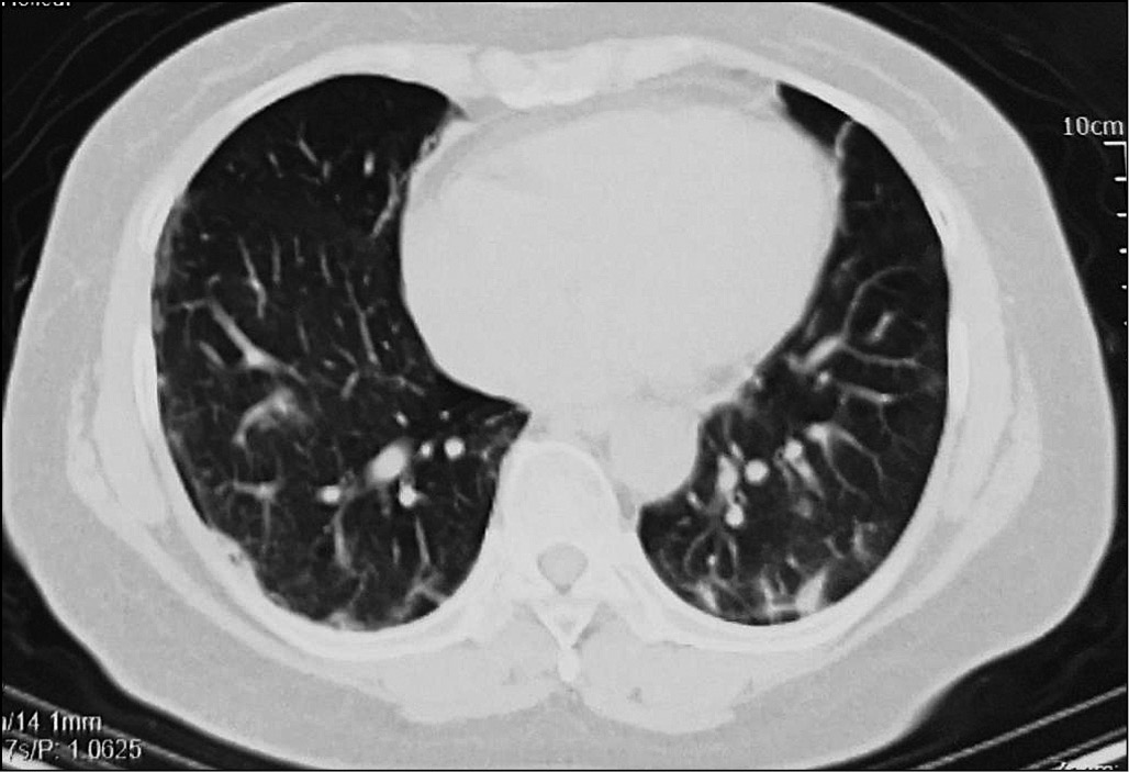 Компьютерная томография. Всего за время исследования получено 115 результатов КТ лёгких. По первым КТ-изображениям, выполненным до лечения, у 45,3% пациентов выявлен симптом «матового стекла», у 65,6% — бронхит, у 21,9% — фиброз, у 14,1% — кальциноз, у 12,5% — узловые образования. У 2 пациентов обнаружено утолщение плевры, у 3 — каверна лёгкого, у 2 — застарелый туберкулёз лёгких. Согласно результатам, между двумя возрастными группами не найдено статистически значимого различия по большей части поражений (p > 0,05); табл. 1, рис. 1–3.