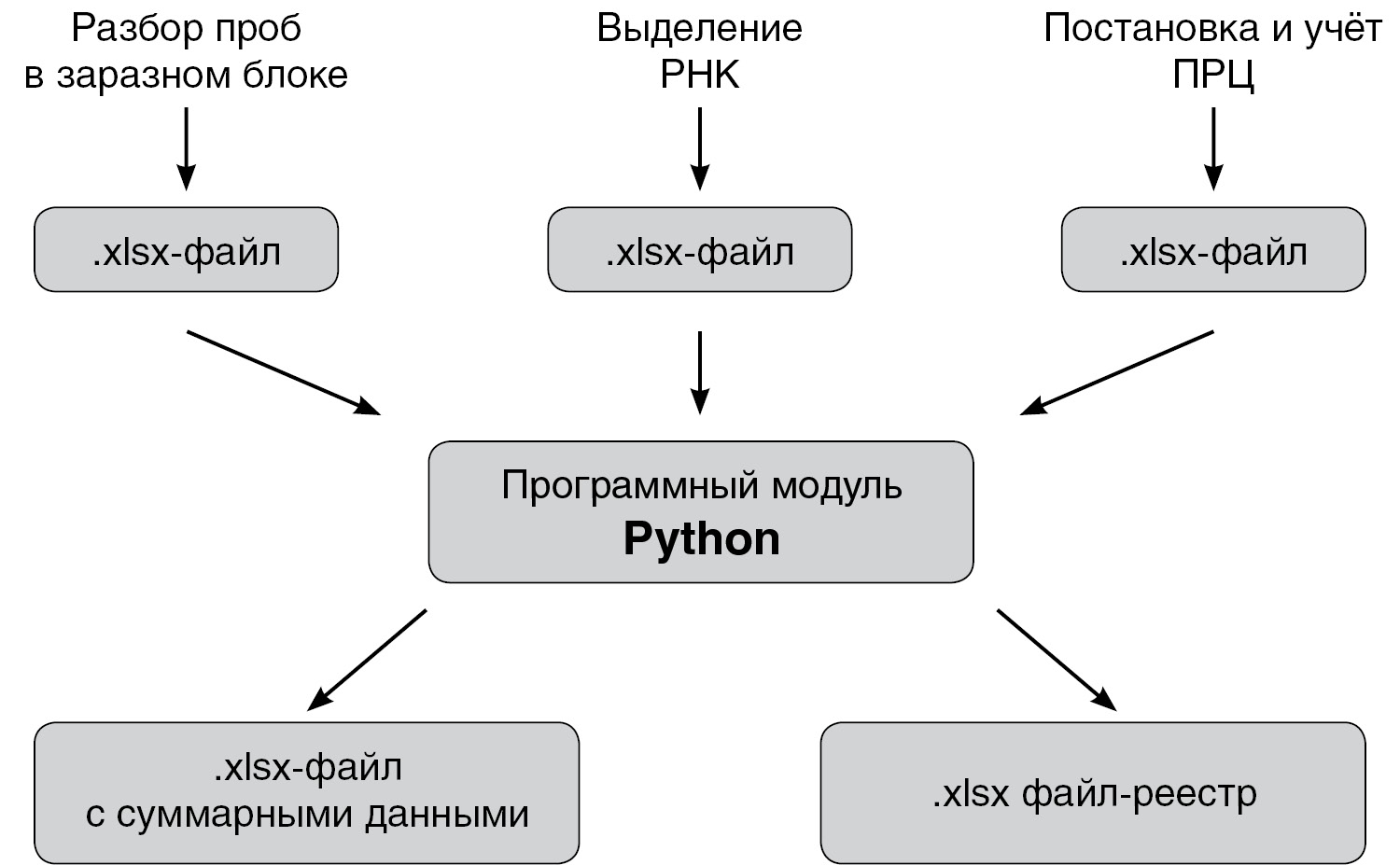 Исходными данными для автоматизации явились файлы xlsx, автоматически генерируемые программным обеспечением амплификатора, и типовые табличные шаблоны, заполняемые на этапах разбора проб и выделения РНК.