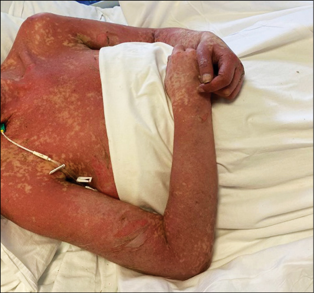 Обычно первые симптомы синдрома Лайелла проявляются в период от 4 до 30 дней от начала приёма лекарственного препарата. Процесс начинается с появления сильно зудящей сыпи по типу крапивницы, которая не купируется антигистаминными препаратами. Затем на коже появляются зудящие волдыри. Состояние сопровождается высокой продолжительной лихорадкой и выраженным синдромом эндогенной интоксикации. Усиливается головная боль, возможна потеря сознания [2, 5]. Развиваются жизнеугрожающие осложнения: токсическая энцефалопатия, острая печёночная недостаточность, острая почечная недостаточность, токсический миокардит. Часто присоединяется бактериальная флора с развитием сепсиса. На фоне болезненности и жжения кожных покровов лица и туловища на слизистых оболочках появляются высыпания различного размера, часто сливного характера, с выраженным отёком кожи. Для прогноза клинического исхода используется шкала оценки тяжести токсического эпидермального некролиза (SCORe of Toxic Epidermal Necrosis, SCORTEN). Критерии: возраст старше 40 лет, частота сердечных сокращений более 120 уд./мин, протяжённость эпидермальной отслойки в первый день болезни >10%, уровень сывороточной мочевины >10 ммоль/л, уровень бикарбоната <20 ммоль/л, уровень глюкозы крови >14,0 ммоль/л, наличие сопутствующих онкологических заболеваний [10]. По данной оценочной шкале у пациентки было три фактора риска (смертность ― 35,3%).