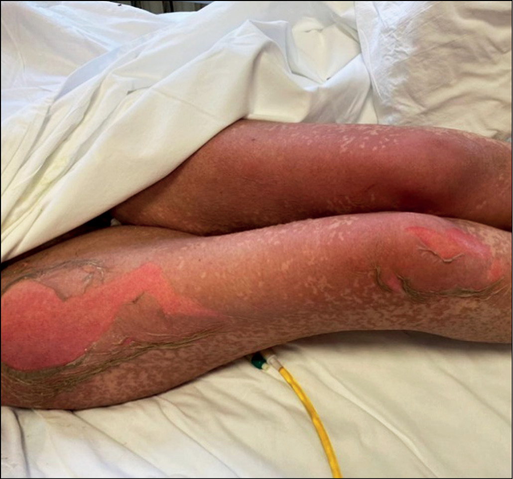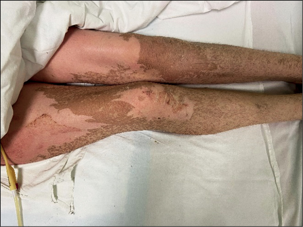 Объективно при поступлении в отделение интенсивной терапии. Состояние тяжёлое. Сознание ясное; ориентирована верно, всесторонне; адекватна. Жалобы на слабость, боль во всём теле, высыпания по всей площади кожного покрова, сухость во рту, слезотечение, боль в глазах. Цвет кожных покровов гиперемирован. Влажность кожи повышена. Тургор сохранён. Отёки отсутствуют. Слизистая оболочка ротоглотки гиперемирована, отёчна. На слизистой оболочке щёк, мягкого нёба множественные афты. Сливная гиперемия на коже лица, туловища и конечностей. Множество булл, часть из которых вскрывшиеся, изменения более выражены на нижних конечностях (рис. 1, 2). В лёгких аускультативно дыхание жёсткое, проводится во все отделы, хрипов нет. Частота дыхания 20/мин. SpO2 96%. Тоны сердца ритмичные, звучные. Артериальное давление 110/70 мм рт.ст. Пульс соответствует частоте сердечных сокращений ― 96/мин. Язык влажный, обложен белым налётом. Живот при пальпации мягкий, безболезненный. Перитонеальных знаков нет. Перистальтика выслушивается, активная. Симптом поколачивания отрицательный с двух сторон. Мочеиспускание по катетеру, диурез не снижен, моча жёлтого цвета.