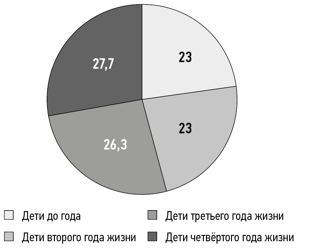 Рис. 1. Распределение детей, нуждающихся в услугах ранней помощи в 2019 г., по возрасту, %.