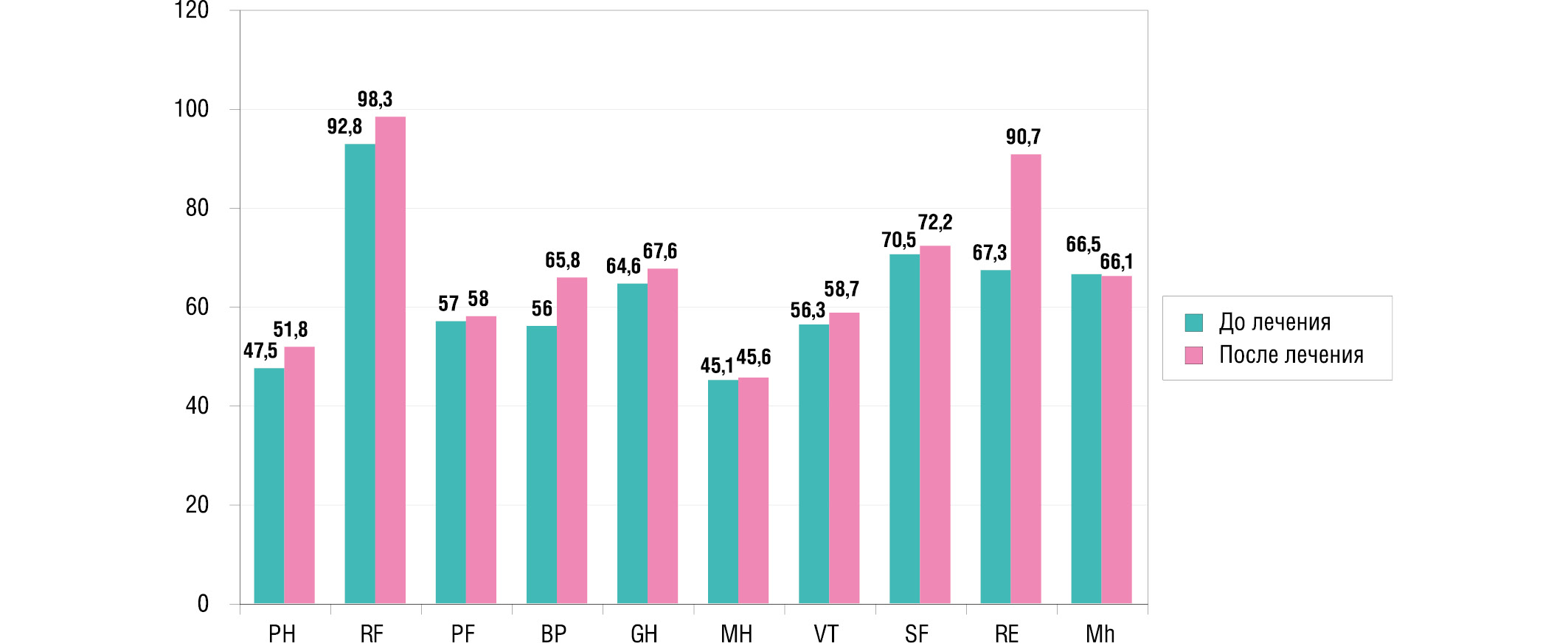 Исследование качества жизни проводилось при помощи опросника SF-36 (Medical Outcomes Study 36-Item Short Form Health Survey) до и после проведённого лечения. Результаты представлены в виде оценок в баллах по 8 шкалам, составленных таким образом, что более высокая оценка указывает на более высокий уровень качества жизни.