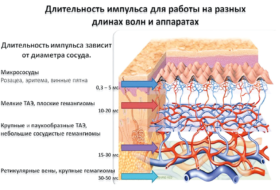 Рис. 2. Варианты длительности импульса и глубины проникновения. Примечание. ТАЭ ― телеангиэктазии. / Fig. 2. Variants of pulse duration and penetration depth. Note: TAE ― teleangiectasia.