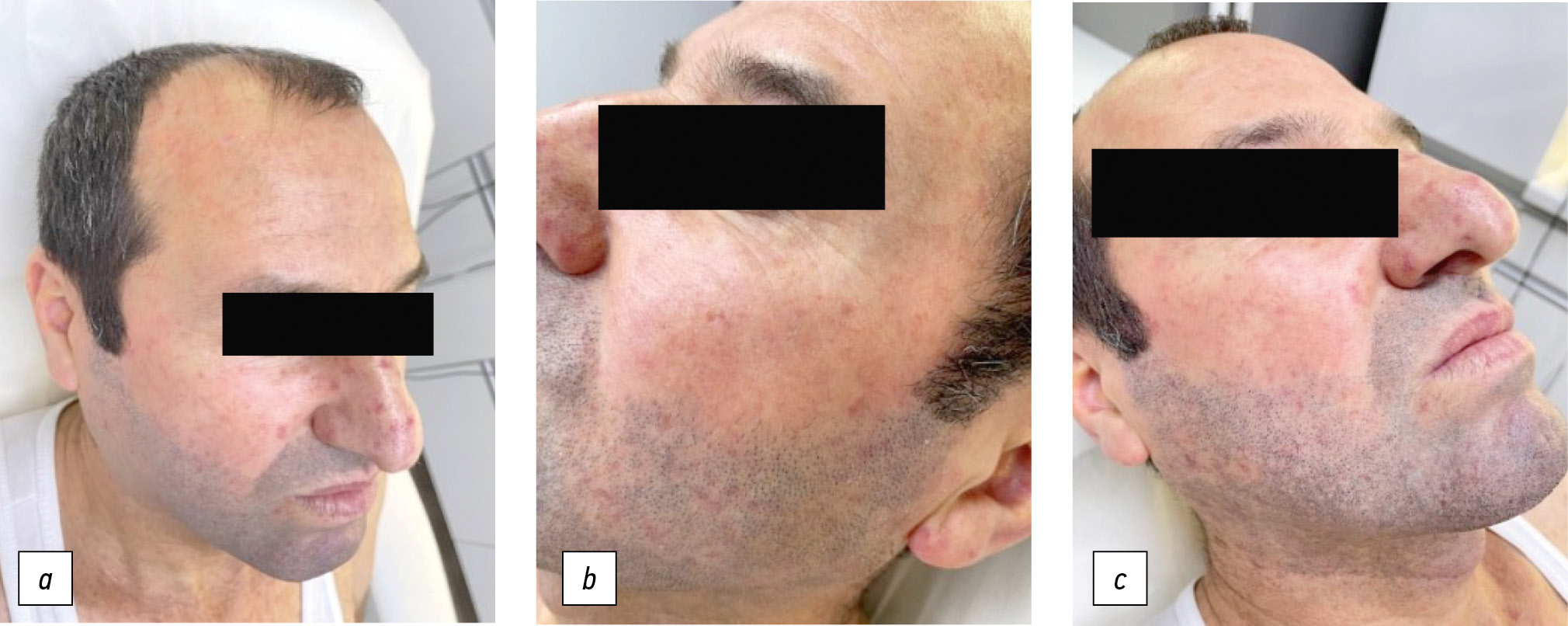 Рис. 3. Тот же пациент. Клиническая картина через 1,5 мес после третьей процедуры. Кожа правой (а) и левой (b) половины лица чистая, единичные телеангиэктазии на коже носа (с). / Fig. 3. The same patient. The clinical picture is 1.5 months after the third procedure. The skin of the right (a) and left (b) half of the face is clean, single teleangiectasias on the skin of the nose (c).