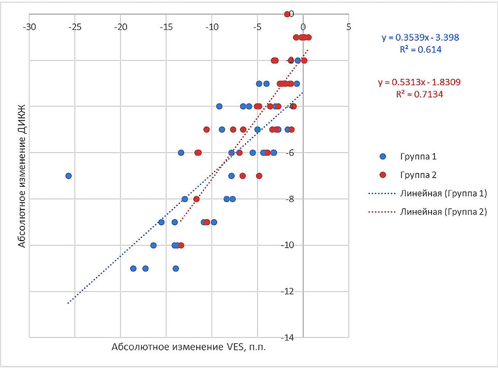 Рис. 1. Диаграммы рассеяния абсолютных изменений ДИКЖ и VES с аппроксимацией линейной зависимостью в каждой группе.