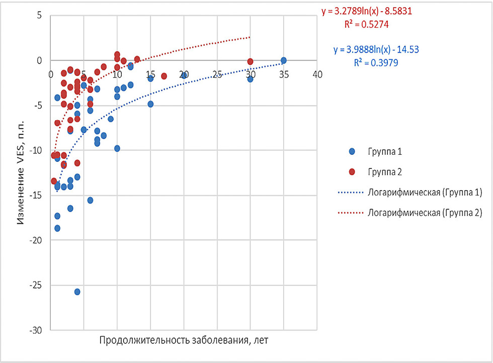 Рис. 2. Диаграммы рассеяния продолжительности заболевания и абсолютных изменений VES с аппроксимацией логарифмической зависимостью в каждой группе.