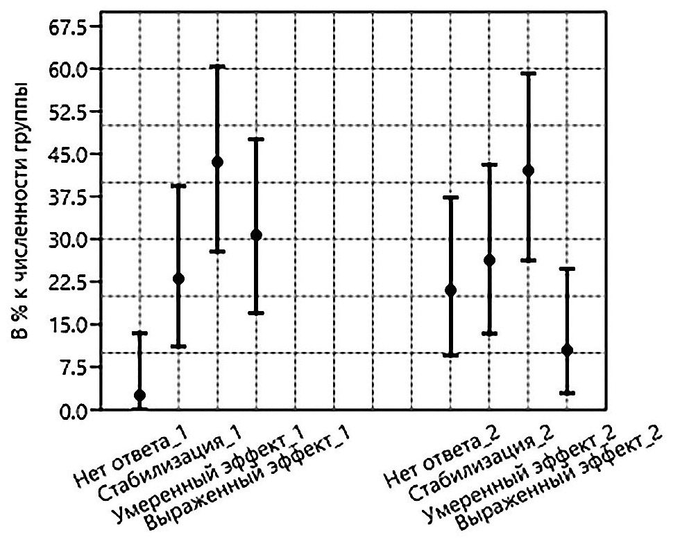 Проведённый статистический анализ показал, что различия групп по результатам лечения статистически значимы на уровне 0,05. Попарное сравнение частоты результатов лечения с помощью точного критерия Фишера продемонстрировало, что на уровне значимости 0,05 различается только частота подгрупп «Нет ответа» (в группе 1 меньше) и «Выраженный эффект» (в группе 1 больше); рис. 3.