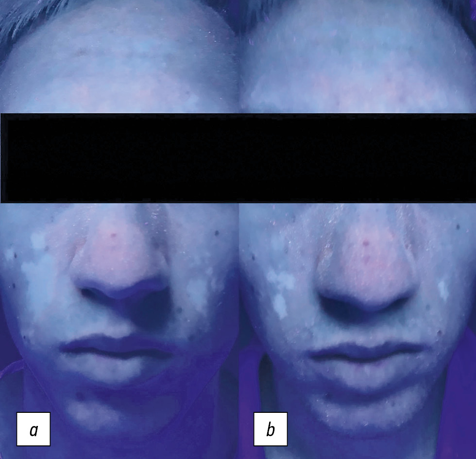 Fig. 4. Results of methotrexate therapy in combination with NB UVB-311 nm (under the rays of Wood’s fluorescent lamp): a ― before treatment; b ― during treatment (after 3 months of therapy).