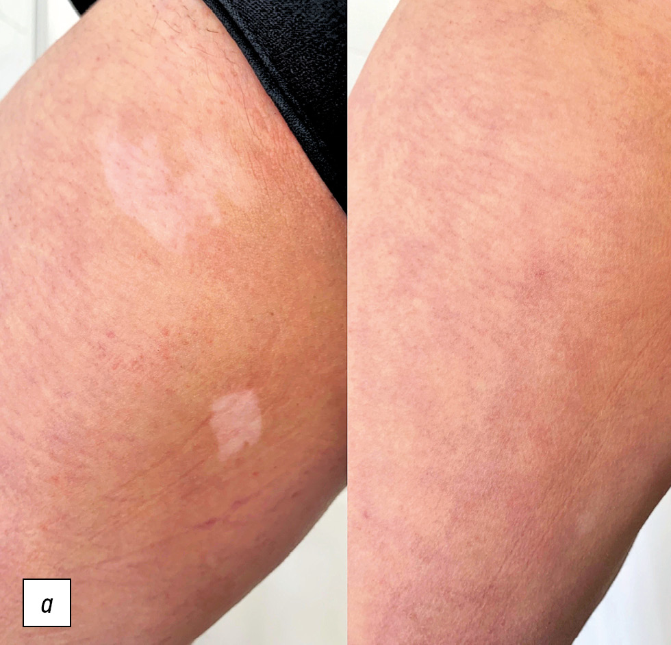 Рис. 4. Результаты терапии метотрексатом в сочетании с УФБ-311 нм (под лучами люминесцентной лампы Вуда) : а ― до лечения; b ― в процессе лечения (после 3 мес терапии).