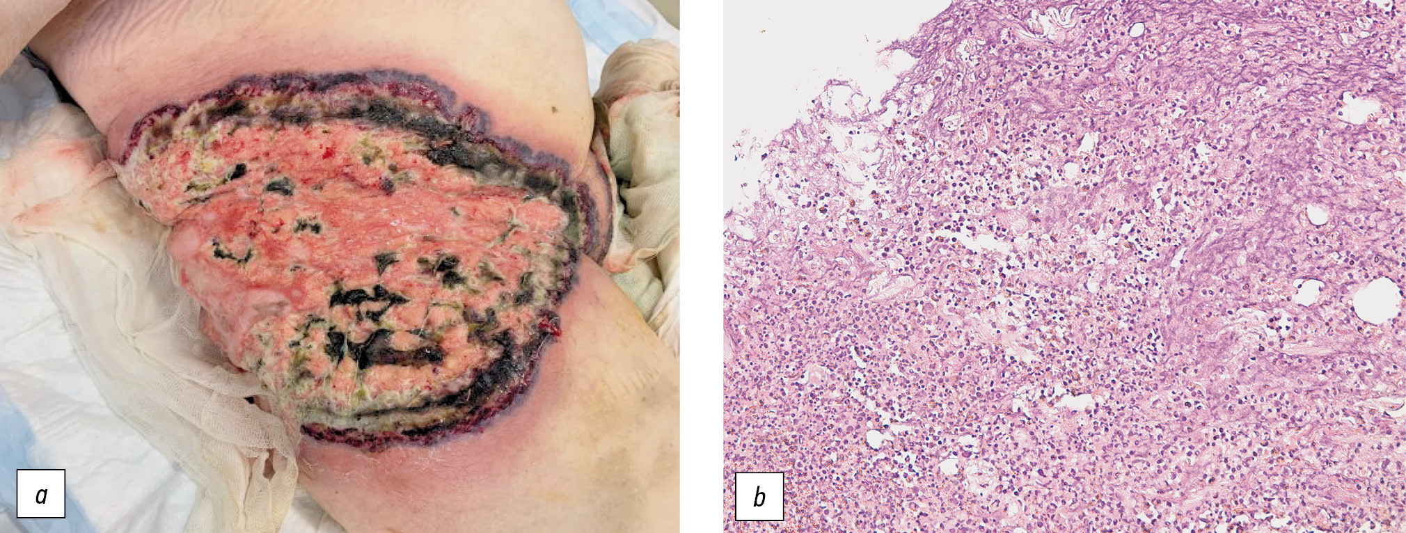 Рис. Гангренозная пиодермия: а ― язвенная (классическая) форма: обширная язва в области боковой поверхности туловища с валикообразно приподнятыми краями багрово-синюшной окраски и зоной эритемы вокруг очага; дно язвы покрыто гнойно-геморрагическим экссудатом; b ― гистопатологическое исследование: обильная нейтрофильная инфильтрация дермы. Окраска гематоксилином и эозином, ×200.