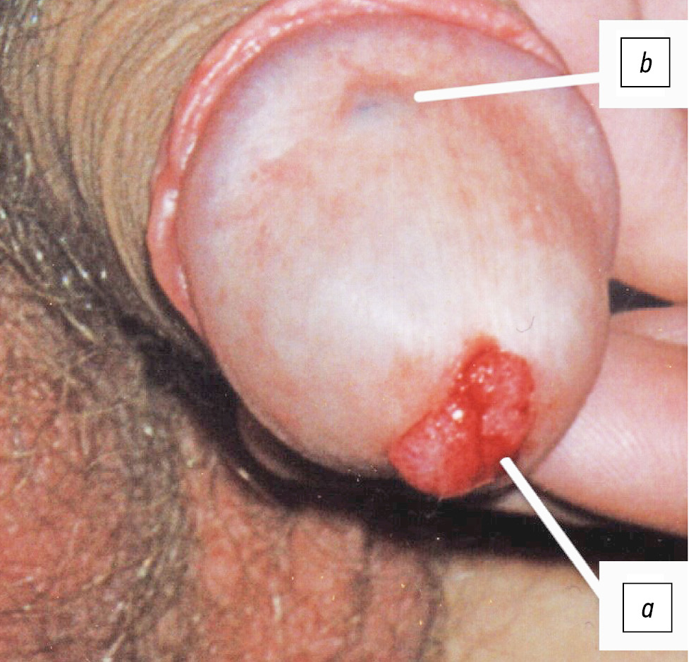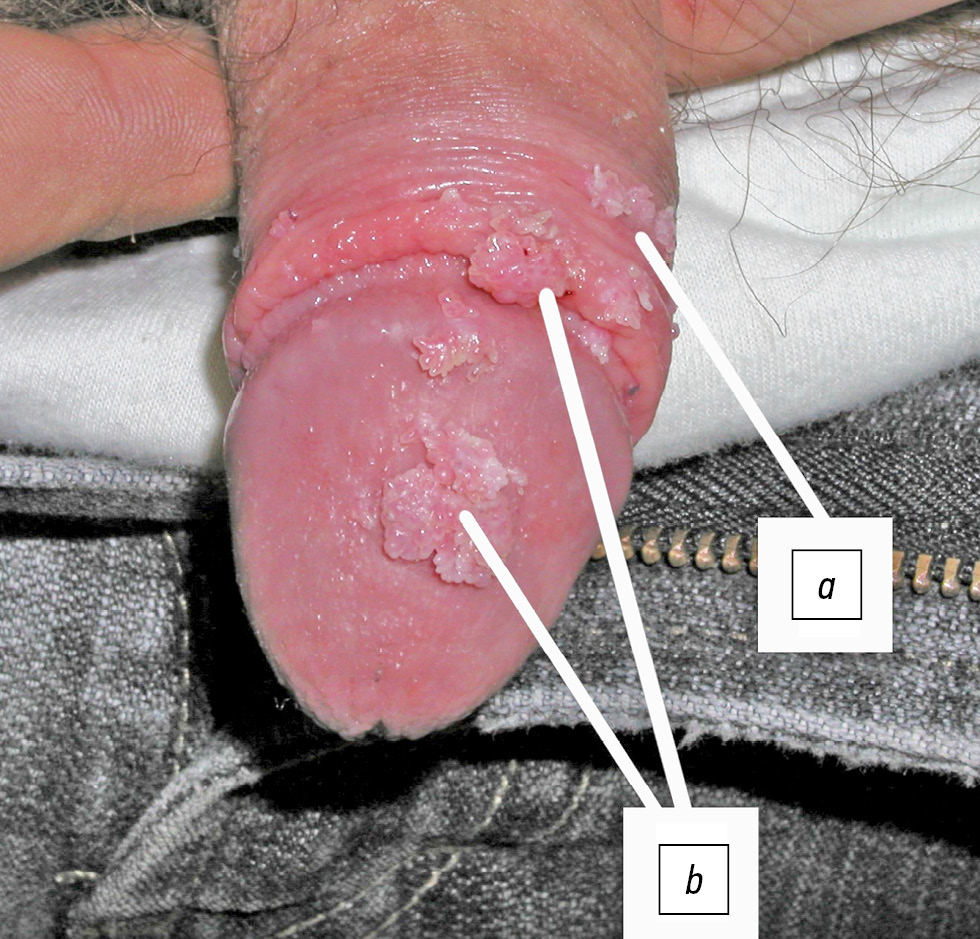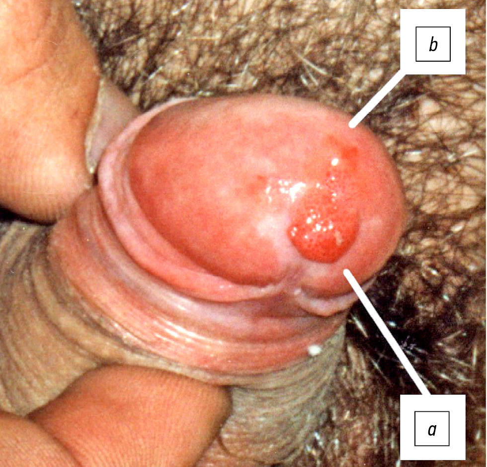 Рис. 1. Больной С., 24 года. Диагноз: «Аногенитальные бородавки головки полового члена и внутреннего листка крайней плоти». Имеются экзофитные разрастания в виде остроконечных (а) и папулёзных кондилом (b) розового цвета, с чёткими границами; отдельные образования на ножке, склонные к росту, залегают на фоне неизменённой кожи.