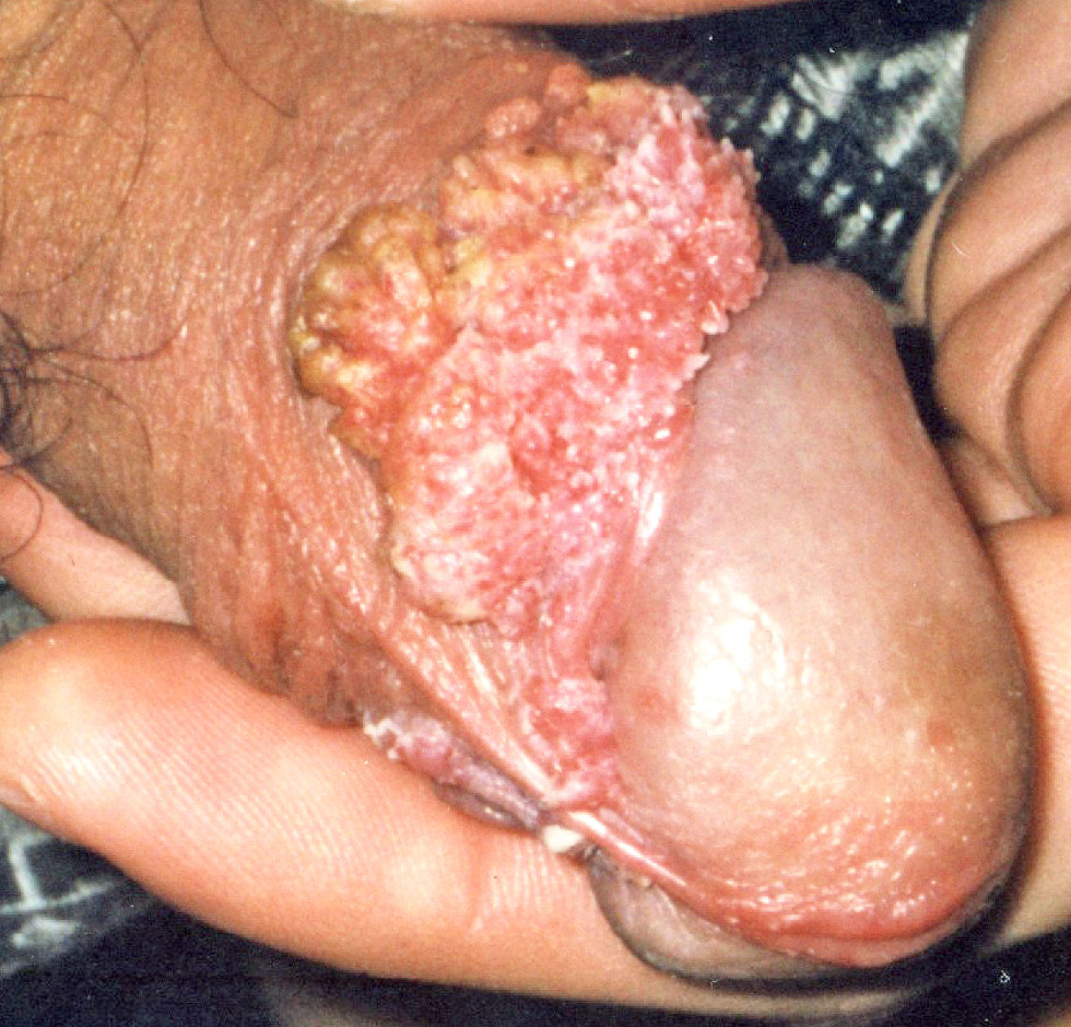 Рис. 2. Больной В., 32 года. Диагноз: «Аногенитальные бородавки внутреннего листка крайней плоти и уздечки полового члена». Разрастания в виде плоских папул с общим широким основанием напоминают «цветную капусту», имеют чёткие границы, залегают на фоне неизменённой кожи.