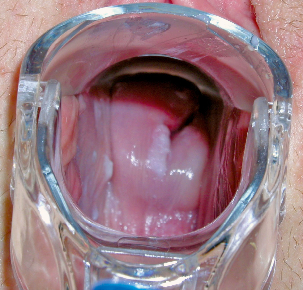 Fig. 4. Patient K., 24 years old. Diagnosis: “Anogenital warts of the cervix”. Papular condylomas on the cervix with spreading to the cervical canal, whitish color (color changed after diagnostic test with 3% acetic acid solution).