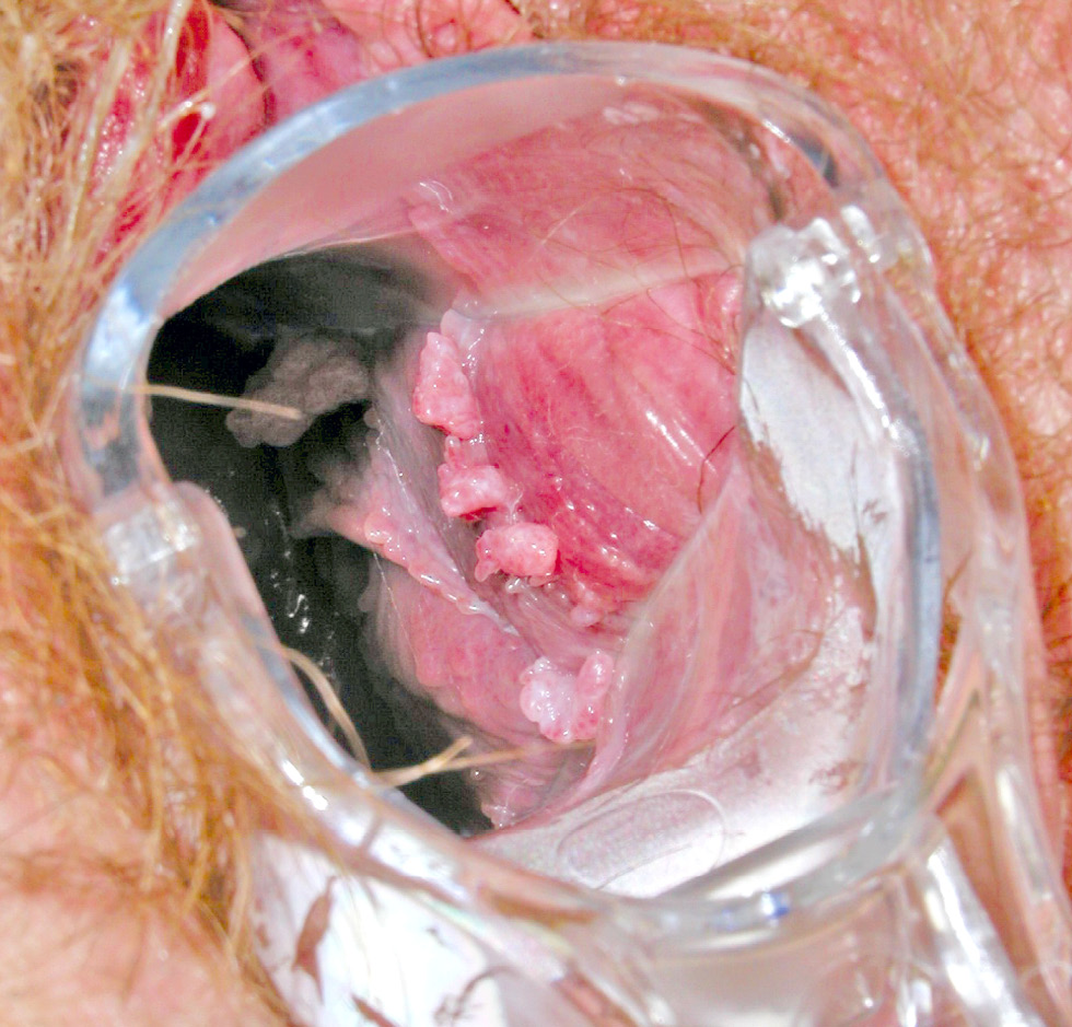 Fig. 5. The same patient. Anogenital warts in the vaginal fornix. Pink acute condylomas with clear borders on the background of visibly unchanged mucosa.