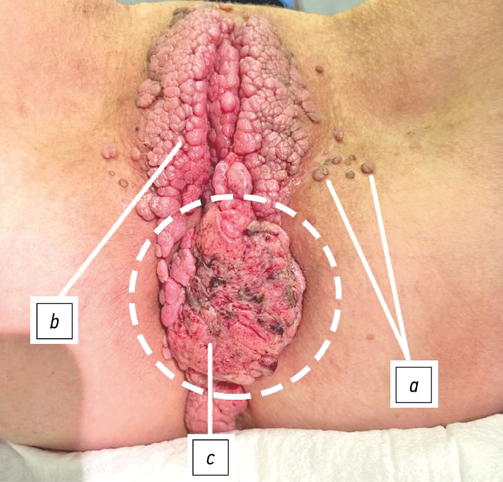 Fig. 10. Patient T., 36 years old. Diagnosis: “Anogenital warts (hyperkeratotic and Buschke–Lowenstein tumors) of the external genitalia, perianal area and inguinal folds”. Concomitant diagnosis: “Squamous cell carcinoma in the area of the labia majora and the lower commissure”. There were isolated brownish hyperkeratotic lesions on the skin of the inguinal folds and labia majora (a). There are Buschke–Lowenstein tumors on the labia majora and perianal region (b), reddish-brown, with lobular separation on the surface. There is a painful red-black dense infiltrate, up to 4 cm in diameter, in the area of the lower adhesion (c). The inguinal lymph nodes are enlarged on both sides, up to the size of a “bean”, painful on palpation.