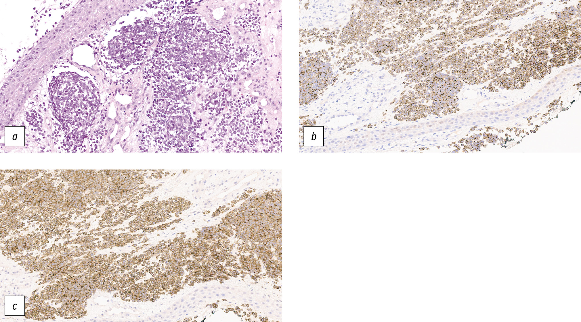 Рис. 2. Иммуногистохимическое исследование: а ― рост опухоли в дерме (окраска гематоксилином и эозином, × 200); b ― характерное позитивное точечное перинуклеарное окрашивание опухолевых клеток в реакции с СК20 (иммуногистохимическая реакция, × 200); с ― диффузное позитивное цитоплазматическое окрашивание опухолевых клеток в реакции с синаптофизином (иммуногистохимическая реакция, × 200). / Fig. 2. Immunohistochemical examination: a ― tumor growth in the dermis (staining with hematoxylin and eosin, × 200); b ― characteristic positive point perinuclear staining of tumor cells in reaction with SC20 (immunohistochemical reaction, × 200); c ― diffuse positive cytoplasmic staining of tumor cells in reaction with synaptophysin (immunohistochemical reaction, × 200).