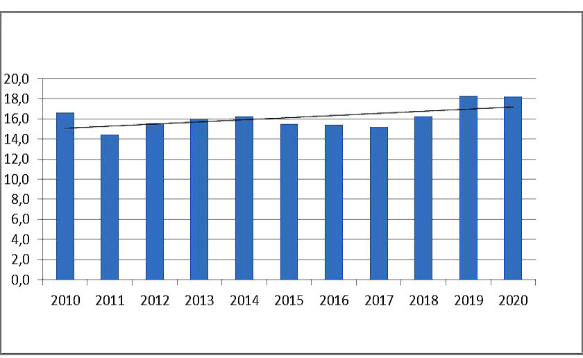 Распространённость псориаза среди общего населения Республики Узбекистан с 2010 по 2020 г. увеличилась с 16,6 до 18,3 на 100 000 населения (рис. 1). По данным тенденции, распространённость псориаза значительнее выросла у женщин, чем у мужчин (18,1 и 9,7% соответственно).