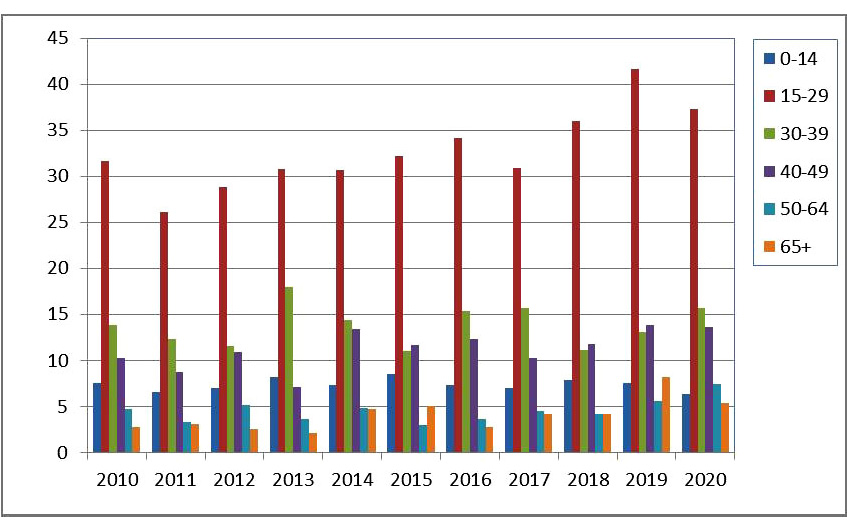 Рис. 2. Распространённость псориаза среди отдельных возрастных групп Республики Узбекистан в 2010–2020 гг.