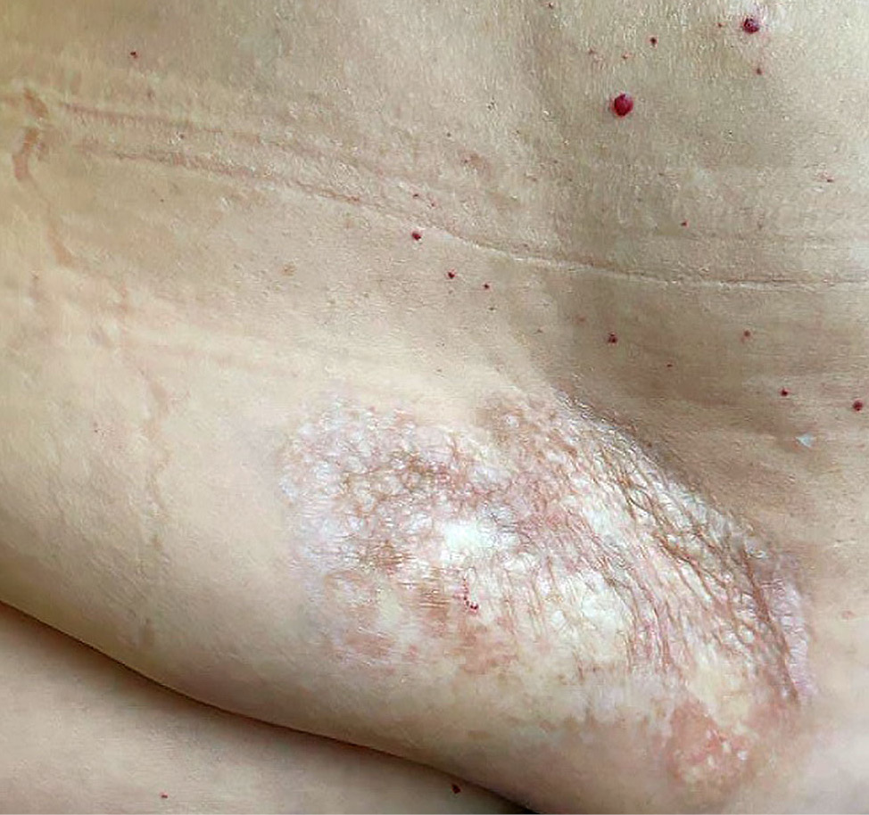 Рис. 3. Тот же пациент. Клинически неактивный очаг (очаг-3; длительность существования >2 лет) представлен бляшкой размером 5×8 см, плотной при пальпации, белого цвета, с участками гиперпигментации и признаками атрофии, рост пушковых волос отсутствует (стадия склероза).