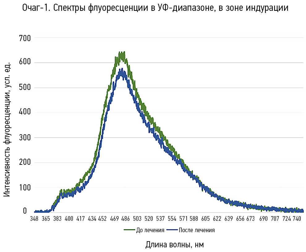 Рис. 4. Пример спектров флуоресценции при длине волны возбуждения 365 нм (УФ-лазер) до и после лечения в зоне индурации очага-1.
