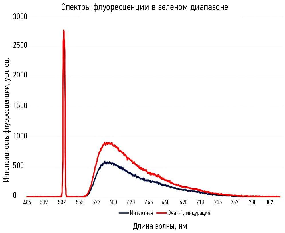 Рис. 5. Пример спектров флуоресценции при длине волны возбуждения 535 нм (зелёный лазер) в зоне индурации очага-1 и интактной кожи.