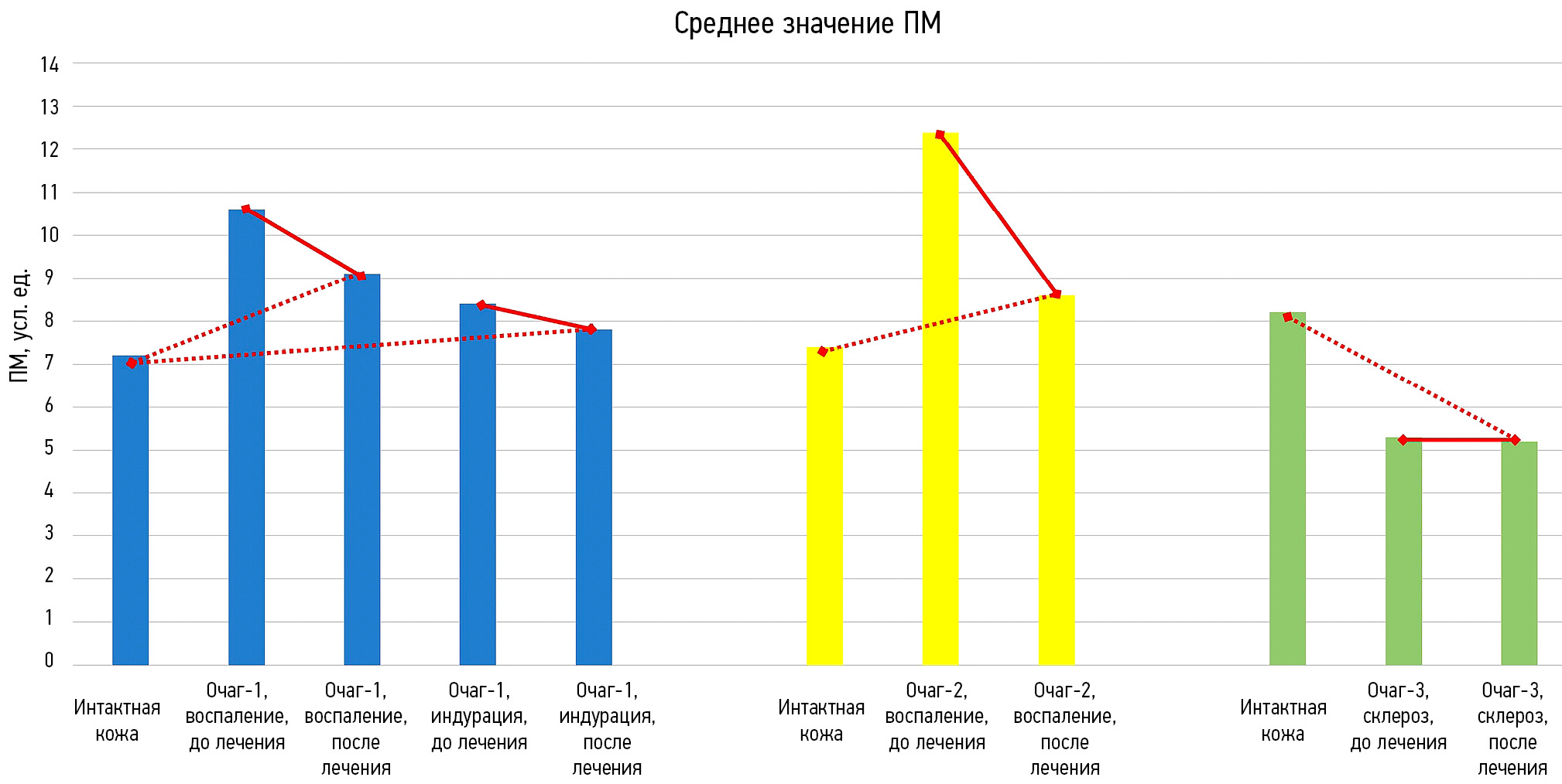 При анализе спектров флуоресценции и данных ЛДФ после лечения нами было обнаружено, что в зонах воспаления (очаг-1 и очаг-2) средние значения индексов флуоресценции порфиринов и липофусцина снижены относительно исходных значений (до лечения), однако остаются по-прежнему выше в сравнении с интактной кожей. Аналогичная динамика наблюдается при анализе среднего значения показателя микроциркуляции до и после лечения. В зоне индурации (очаг-1) также наблюдается умеренное снижение средних значений индексов флуоресценции коллагена (ηf =420 и ηf =455) относительно исходных значений (до лечения), при этом они по-прежнему остаются выше относительно интактной кожи. Полученные данные могут свидетельствовать о том, что активное воспаление в данных очагах на момент исследования сохраняется. При исследовании очага-3 полученные данные аутофлуоресценции и микроциркуляции в динамике значительно не отличаются от исходных значений.