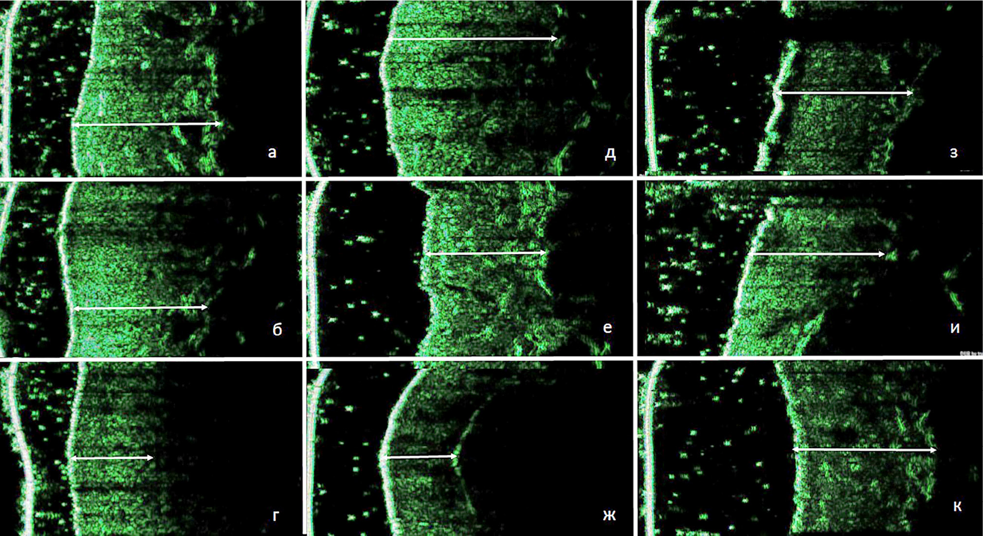 Fig. 7. Ultrasound study: а ― focus-1 (induration before treatment: dermis thickness 1.402 mm; echogenicity 11); б ― focus-1 (induration after treatment: dermis thickness 1.027 mm; echogenicity 17); г ― intact skin for the focus-1 (dermis thickness 0.8 mm; echogenicity 23); д ― focus-2 (inflammation before treatment: dermis thickness 1.891 mm; echogenicity 8), е ― focus-2 (inflammation after treatment: dermis thickness 1.250 mm; echogenicity 14); ж ― intact skin for the focus-2 (dermis thickness 0.7 mm; echogenicity 20); з ― focus-3 (scar before treatment; dermis thickness 1.2 mm; echogenicity 17); и ― focus-3 (scar after treatment: dermis thickness 1.21 mm; echogenicity 17), к ― intact skin for the focus-3 (dermal thickness 1.313 mm; echogenicity 14). The arrows indicate dermis thickness.