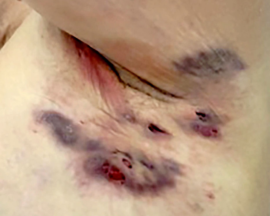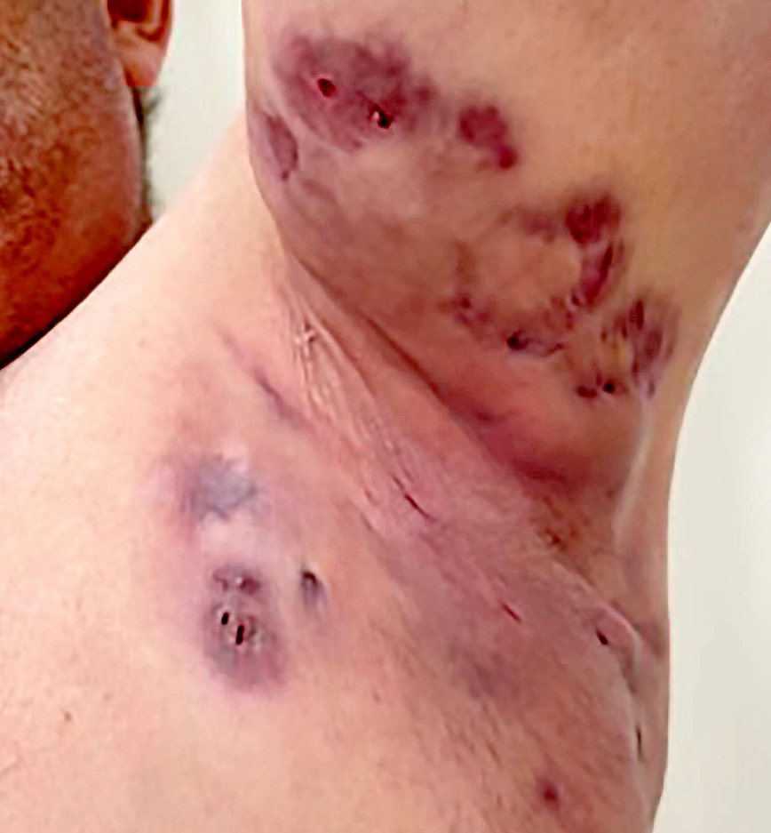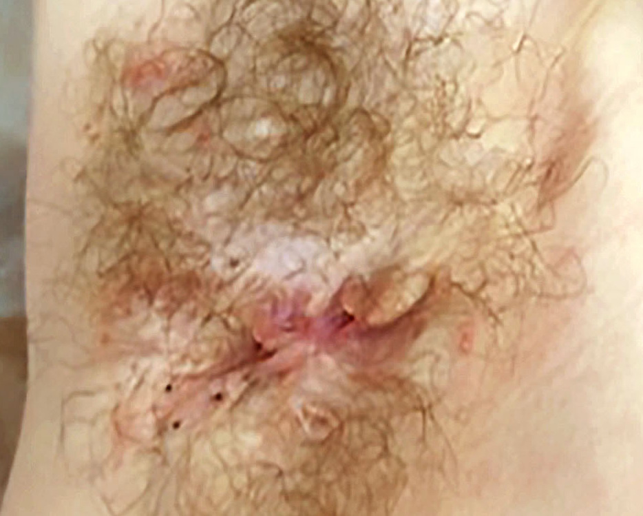 Рис. 3. Пациент А., 52 года. Диагноз: «Гнойный гидраденит подмышечной области, стадия Хёрли III, привычный тип». Характерно диффузное сливное поражение кожи с множественными взаимосвязанными между собой свищевыми ходами. Участков здоровой кожи в зоне поражения практически нет.