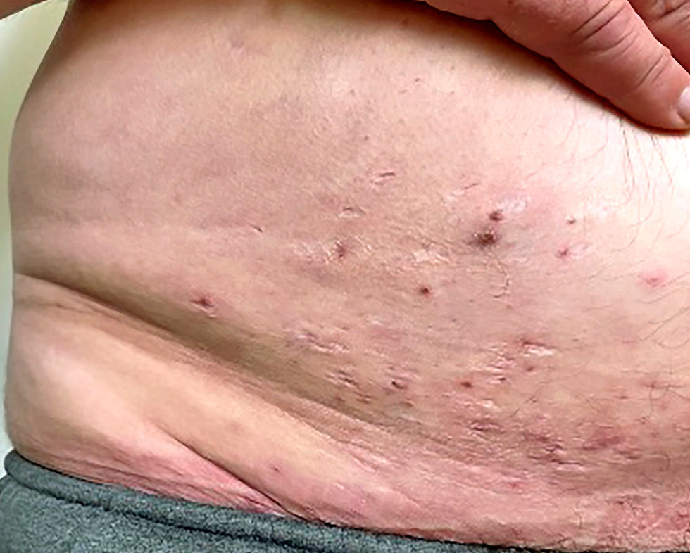 Рис. 5. Пациент Ч., 54 года. Диагноз: «Гнойный гидраденит, вариант по типу фрикционного фурункулёза». Поражение типичных областей и зон, подверженных усиленному трению: живот, бёдра, ягодицы. Развивается у пациентов с избыточной массой тела. На фотографии видны фолликулярные папулы, пустулы и характерные циркулярные атрофические рубцы.