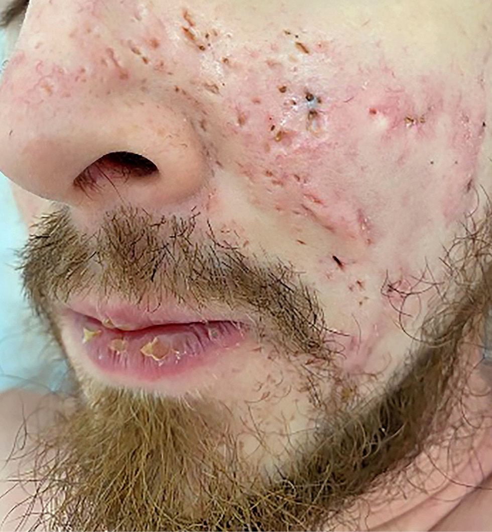 Fig. 6. Patient Ya., 31 years old. Diagnosis: “Hidradenitis suppurativa, Hurley stage II, ectopic type”. Face involvement in addition to typical areas (groin, axillary areas). The photograph shows pathognomonic rope-like hypertrophic scar.