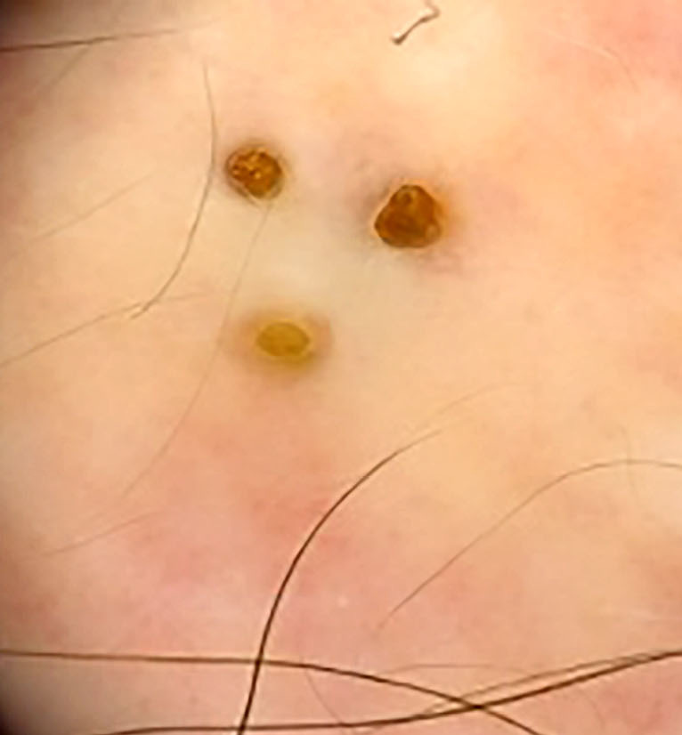 Fig. 8. The same patient (see figures 6 and 7). Dermoscopy of the axillary region. Double-ended pseudocomedones are considered a pathognomonic clinical sign of hidradenitis suppurativa. These signs usually appear in long-lasting disease. Closed comedones are never present in areas of hidradenitis suppurativa.