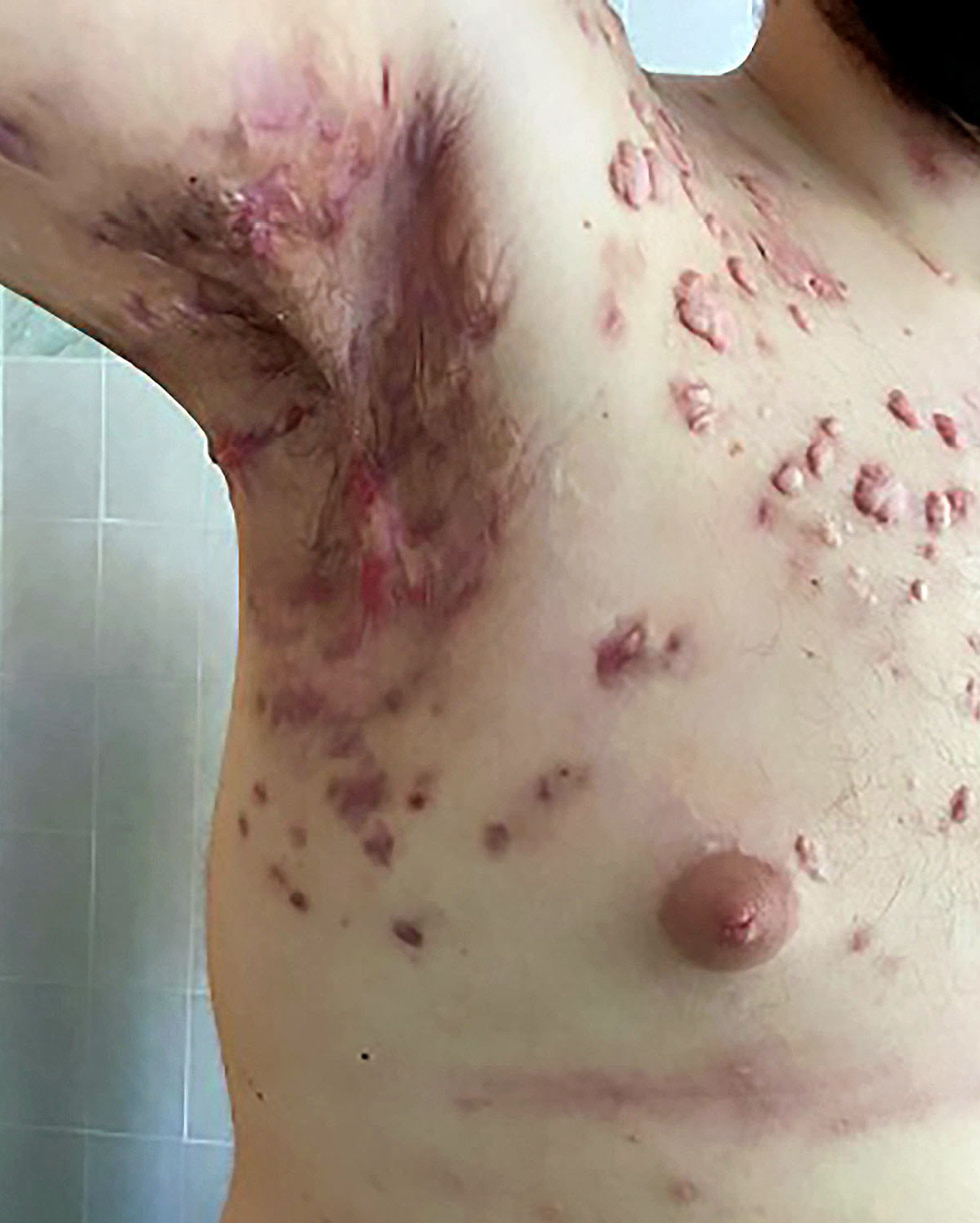 Рис. 1. Пациент Б., 26 лет. Диагноз: «Гнойный гидраденит молочных желёз, стадия Хёрли I, привычный тип». Поражение молочных желёз характерно для пациентов женского пола. Видны немногочисленные воспалительные папулы и узлы («слепые» фурункулы) без рубцевания и формирования свищевых ходов.