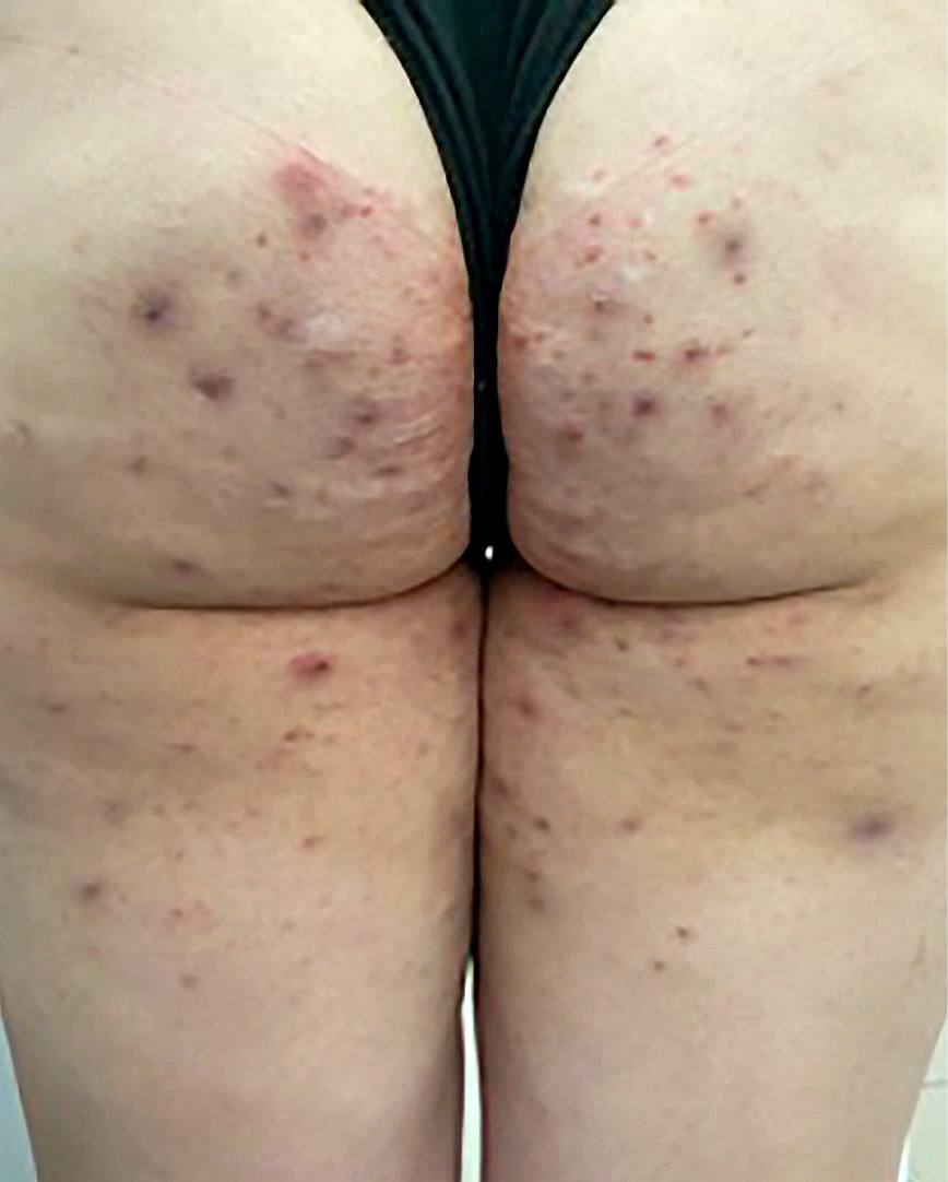 Fig. 11. Patient M., 44 years old. Diagnosis: “Hidradenitis suppurativa, Hurley stage II, PASH syndrome”. One of the 5 types of syndromic hidradenitis suppurativa along with PAPASH, PASS, PsAPASH and SAPHO syndromes. PASH syndrome includes pyoderma gangrenosum, hidradenitis suppurativa and acne conglobata.