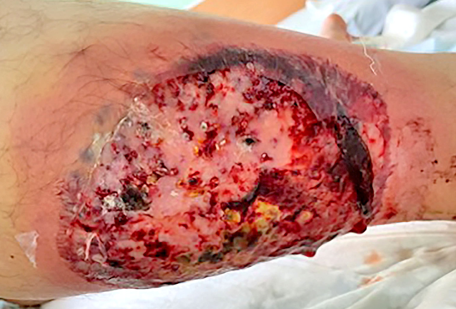 Fig. 4. Patient S., 31 years old. Diagnosis: “Hidradenitis suppurativa, groin and perineum involvement, Hurley stage III, regular type”. Sero-purulent discharge from a draining sinus.