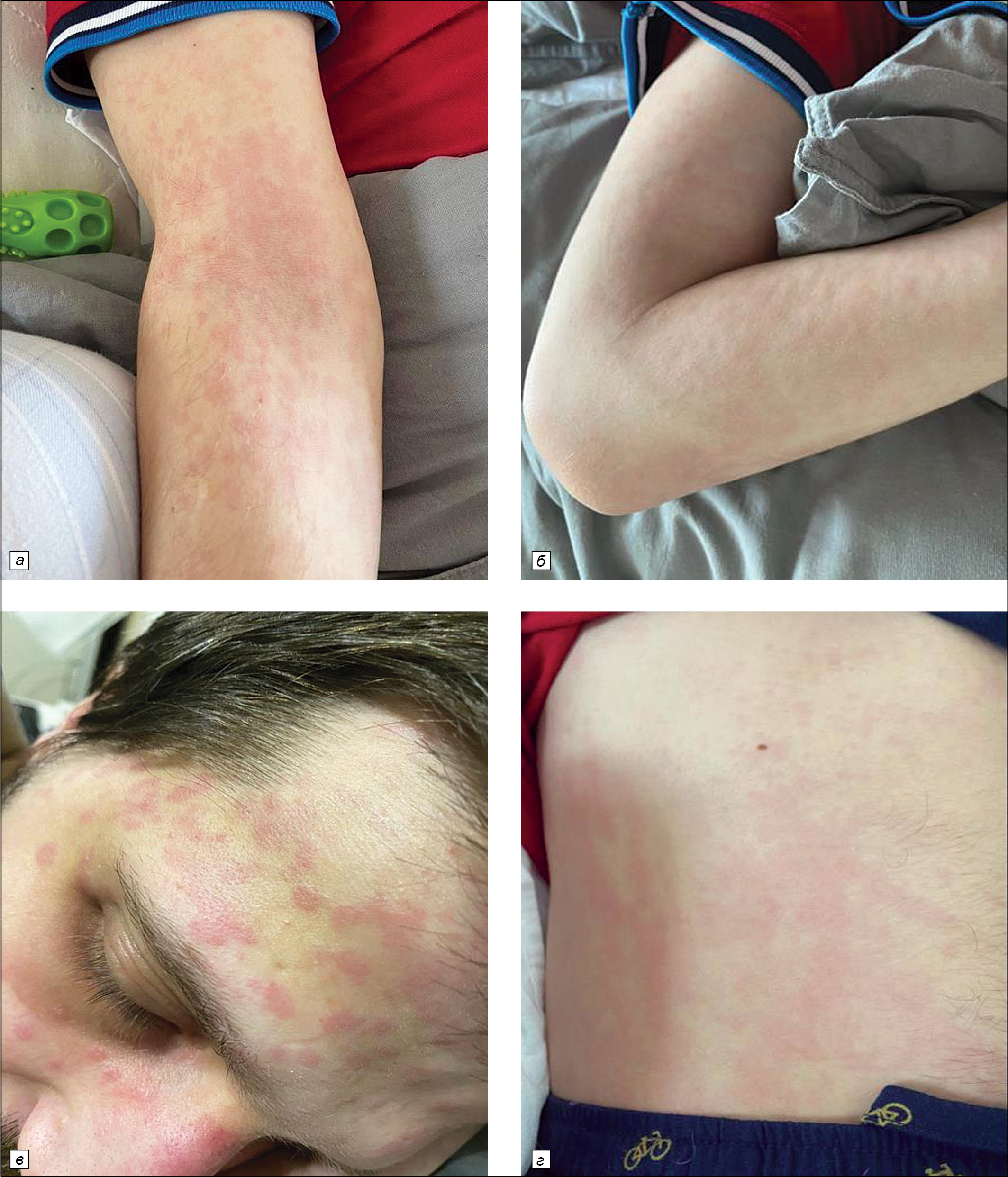 Наблюдалось поражение кожи островоспалительного характера. Сыпь обильная, симметричная с локализацией на коже лица, сгибательных поверхностях предплечий и живота; представлена отёчными пятнистыми элементами с чёткими границами очертаний округлой и неправильной формы размером от 1 до 3 см в диаметре, ярко-розового цвета с гладкой поверхностью. Сыпь на коже сгибательных поверхностей предплечий и живота представлена многочисленными уртикароподобными элементами ярко-розового цвета, неправильных очертаний, имеющими тенденцию к слиянию. Кожа вне очагов поражения бледно-розовой окраски. Тургор и эластичность соответствуют возрасту. Ногтевые пластины и волосы не изменены. Пальпаторно увеличены подчелюстные, заднешейные и подмышечные группы лимфатических узлов. Субъективно отмечается умеренный периодический зуд в местах высыпаний (см. рисунок).