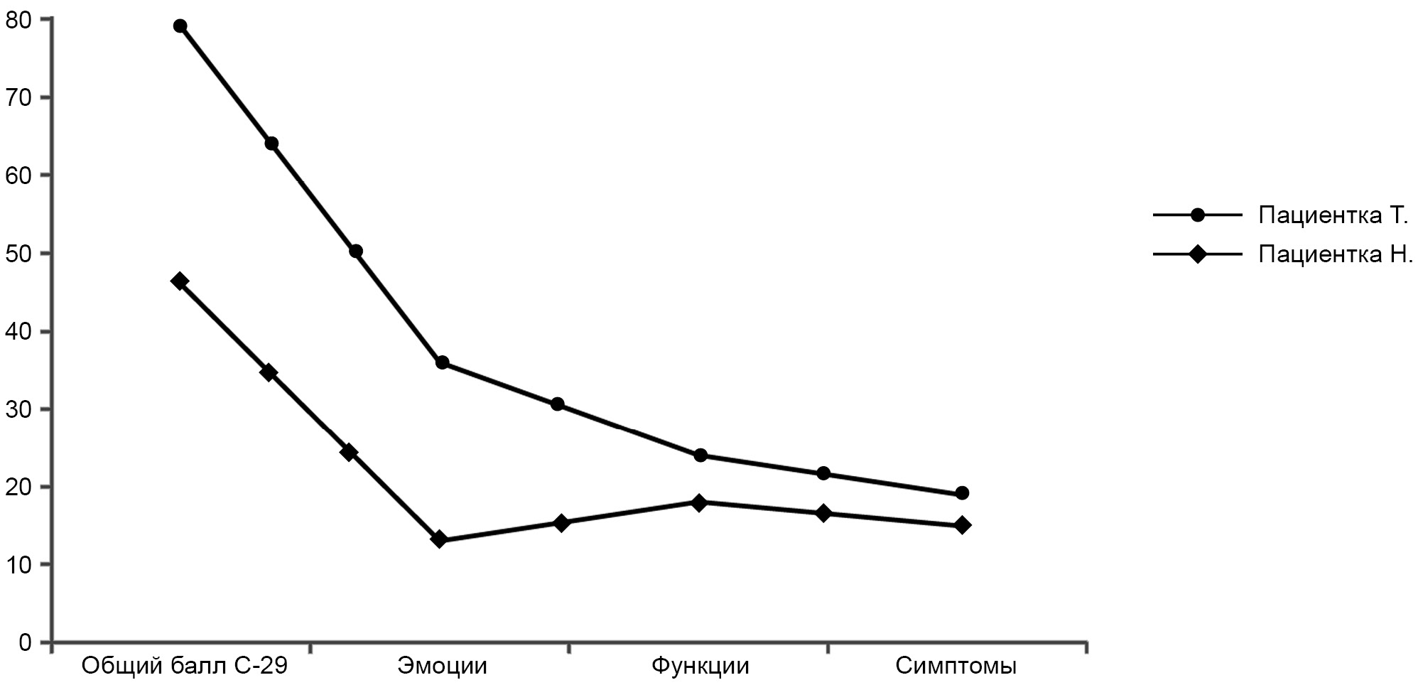 Для демонстрации различий в оценке качества жизни после лечения представляем данные опросников по качеству жизни двух пациенток (см. рисунок).